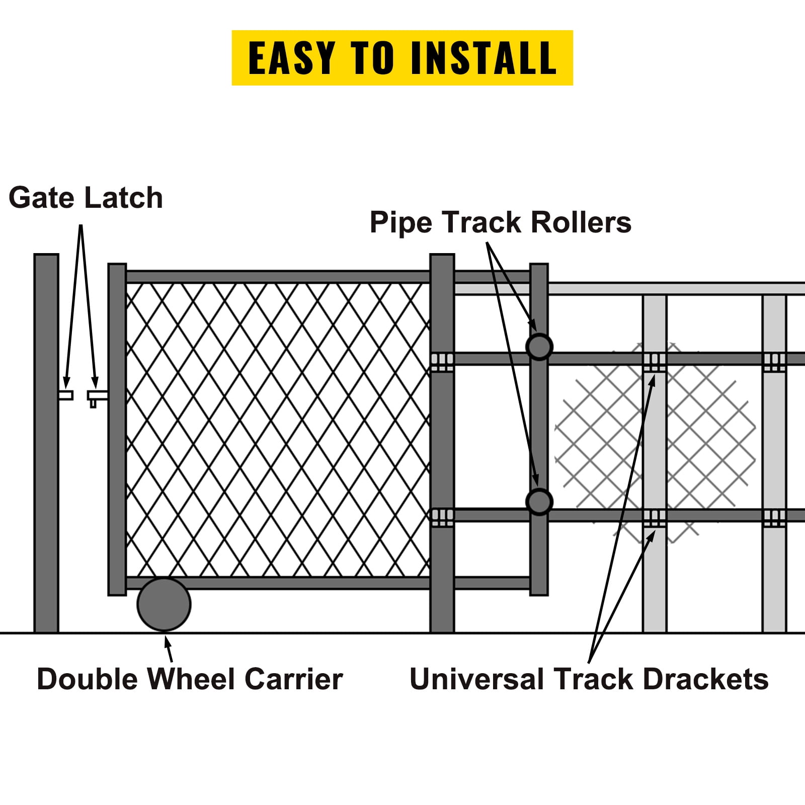 Brand Introduction VEVOR is a leading brand that specializes in equipment and tools. Along with thousands of motivated employees,VEVOR is dedicated to providing our customers with tough equipment & tools at incredibly low prices. Today, VEVOR has occupied markets of more than 200 countries with 10 million plus global members. Why Choose VEVOR? 1.Tough Quality Assurance 2.Incredibly Low Prices 3.Fast & Secure Delivery 4.30-Day Free Returns 5.24/7 Professional Customer Service Product Description Chain Link Rolling Gate Hardware Kit The rolling fence kit is made of premium 201 stainless steel and galvanized steel, durable and not easy to rust and corrosive. There is a double wheel carrier, universal track brackets, pipe track rollers, gate latch, rear-wheel brackets, and wrenches for you, and they can be used to build a sliding door. As long as you follow the instructions, the rolling door kit is very easy to install. Rolling Fence Kit Our package includes all accessories you need to construct the easy door, such as a double wheel carrier, track brackets, etc. You can use them to finish the whole work without any trouble. Stainless & Galvanized Steel This rolling gate kit will make your rolling gate has a long service life. Six U-shaped clamps are made of 201 stainless steel, and the others are all constructed of galvanized steel. 6” Patterned Wheels Different from other rubber wheels, our rubber wheels have a well-designed pattern, which is not easy to slip and has strong friction. You can rest assured to use it. Adjustable Distance There are some screws on the pipe track rollers, and you can adjust the distance between doors by the screws, which can help you solve the problems that are too close or too far between doors. Easy To Install The rolling fence gate hardware is suitable to install a sliding door, and here we will offer you an instruction manual to lead you to complete work. There is no need to worry about installation. Wide Applications The sliding gate hardware kit can be applied to the installation of many rolling gates, and it can be used on your farm, pastures, poultry pens, manor, and any large places you need. Specifications Material: 201 Stainless Steel & Galvanized Steel Package Weight: 30.8 lbs/14 kg Package Dimension: 7.1x 12.4 x 11.9 in/18×31.5×30 cm PackageContent 1 x Double-Wheel Carrier 6 x Universal Track Brackets 2 x Pipe Track Rollers 1 x Roll Gate Latch 2 x Rear Wheel Brackets 2 x Wrenches
