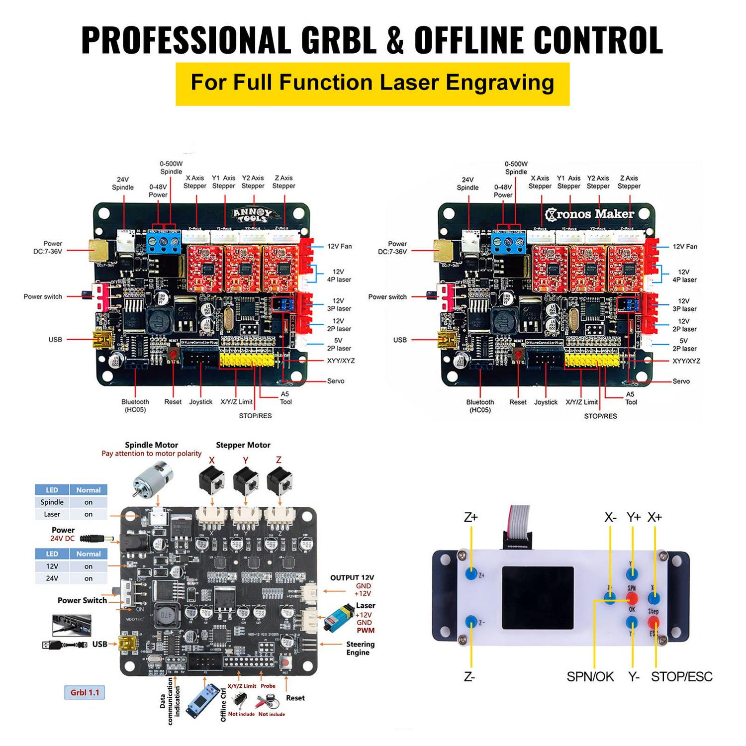 – GRBL & Offline Control: The GRBL control features an XYZ axis drive and full functionality. And the advantages of the offline controller lies in the following ones: 1. No need to connect to the computer. 2. Arbitrary selection of offline files for engraving. 3. Manually adjust the X, Y, and Z axes position as the engraving starting point, manually turn on or off the spindle.
