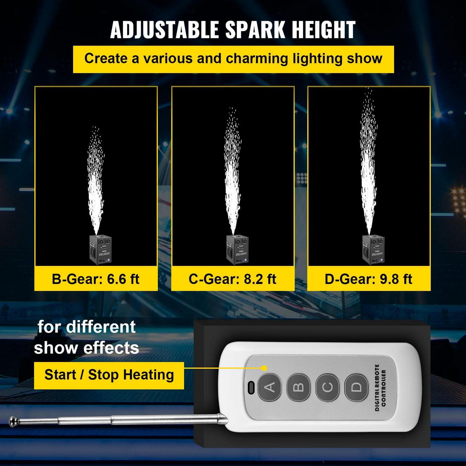 This cold spark machine supports 3-16 ft height spark, 10-level height adjustable. Spark direction: Up; Select the other MDX channel data to change the height.