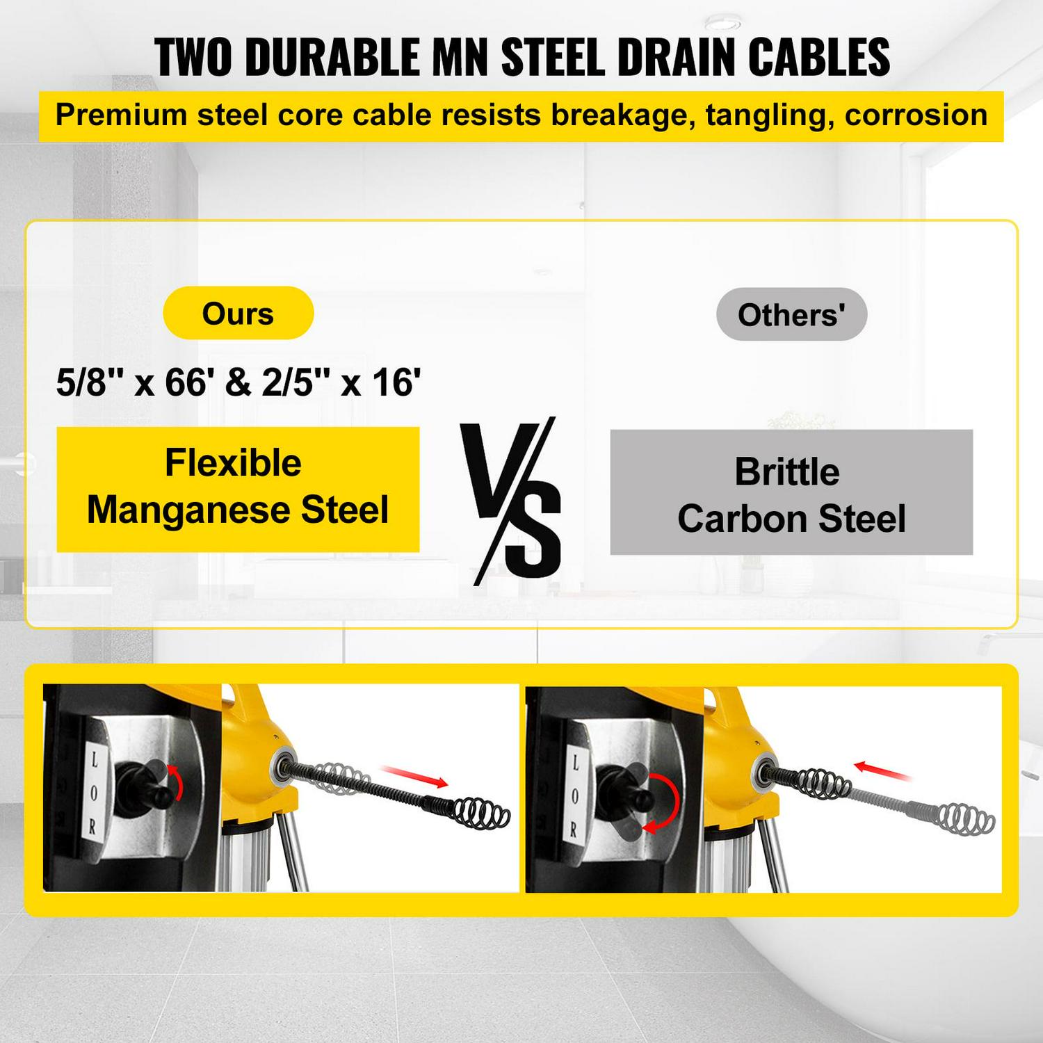 This premium steel core cable effectively resists breakage, tangling, kinking, and corrosion. The drain cleaner machine is suitable for 3/4” – 5”/20-125mm pipe.