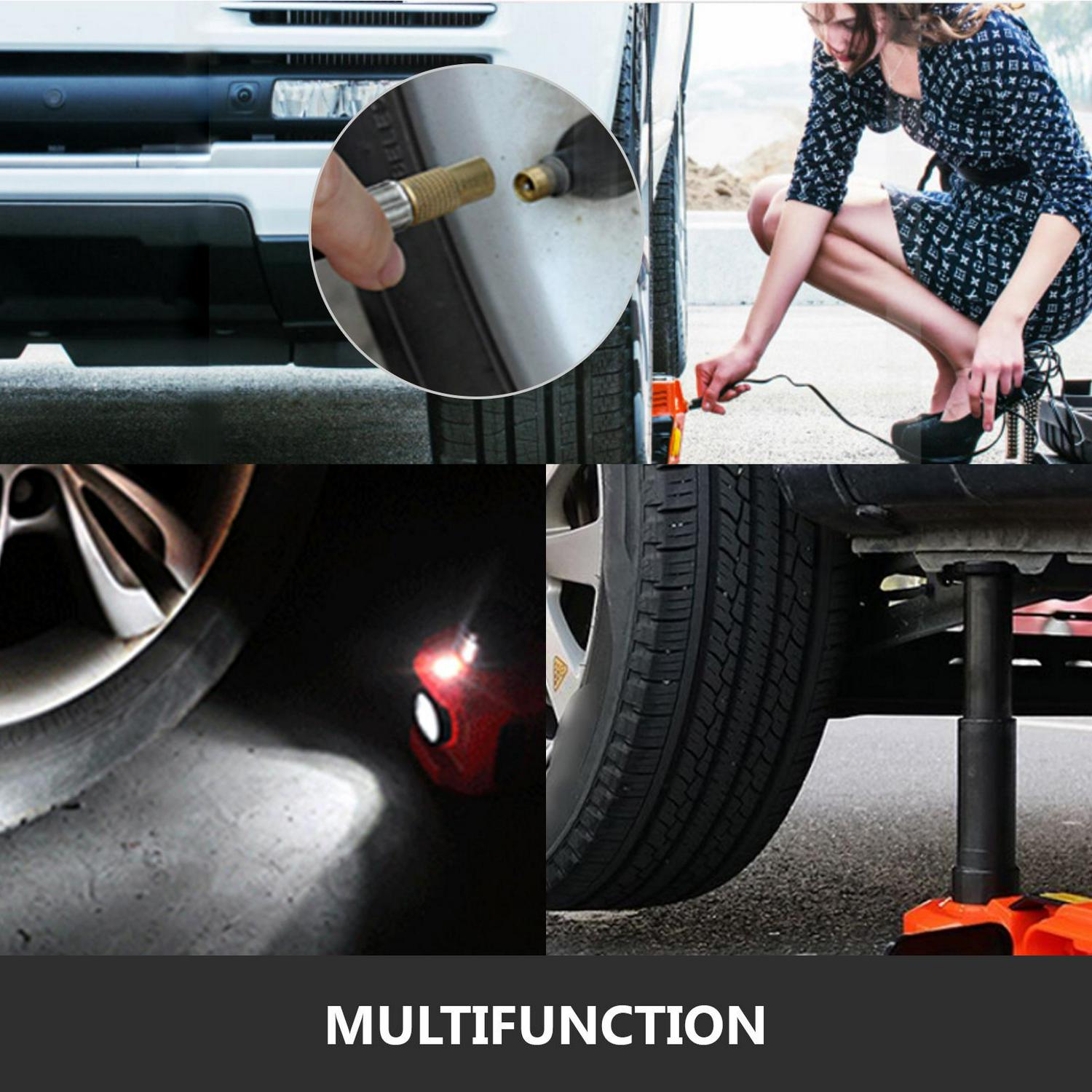 The 12V DC Automatic Electric Car Repair Tool Kit is made for emergency roadside tire change and repair. It is worthy due to its multifunction–car jack, LED light and air pump. Cross groove saddle prevent slipping from vehicle. self-locking power structure and safety unloading knob prevent jack from falling and will not come down immediately. LED helps you operate it in the dark