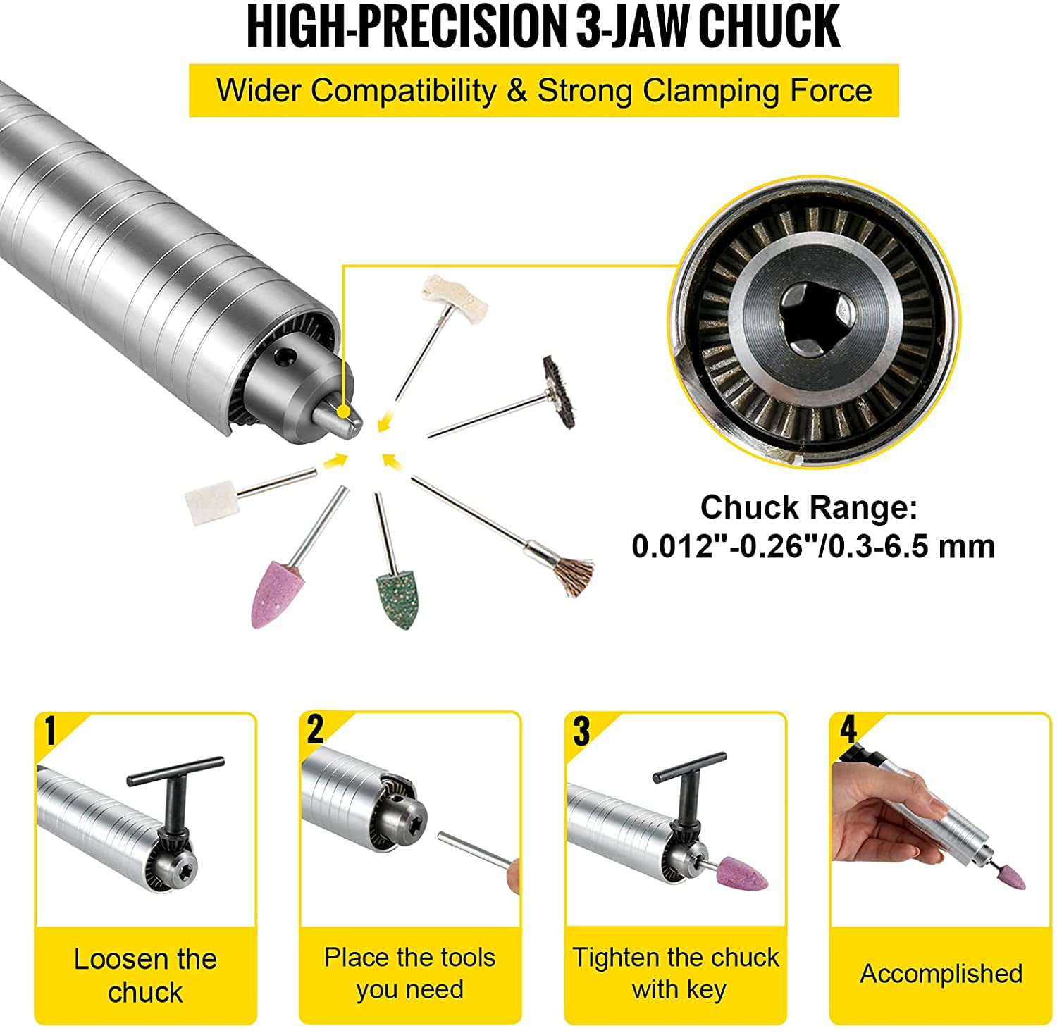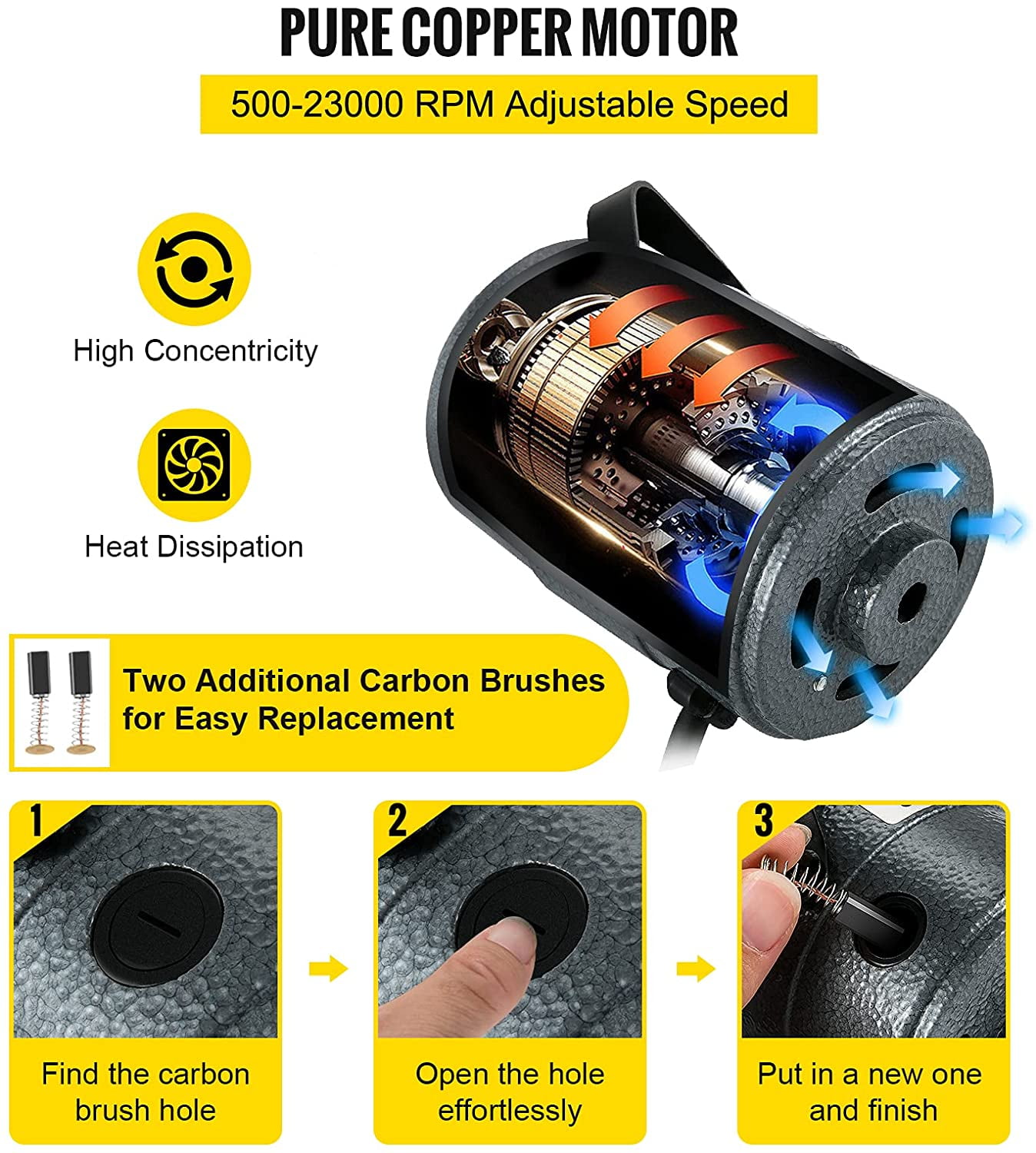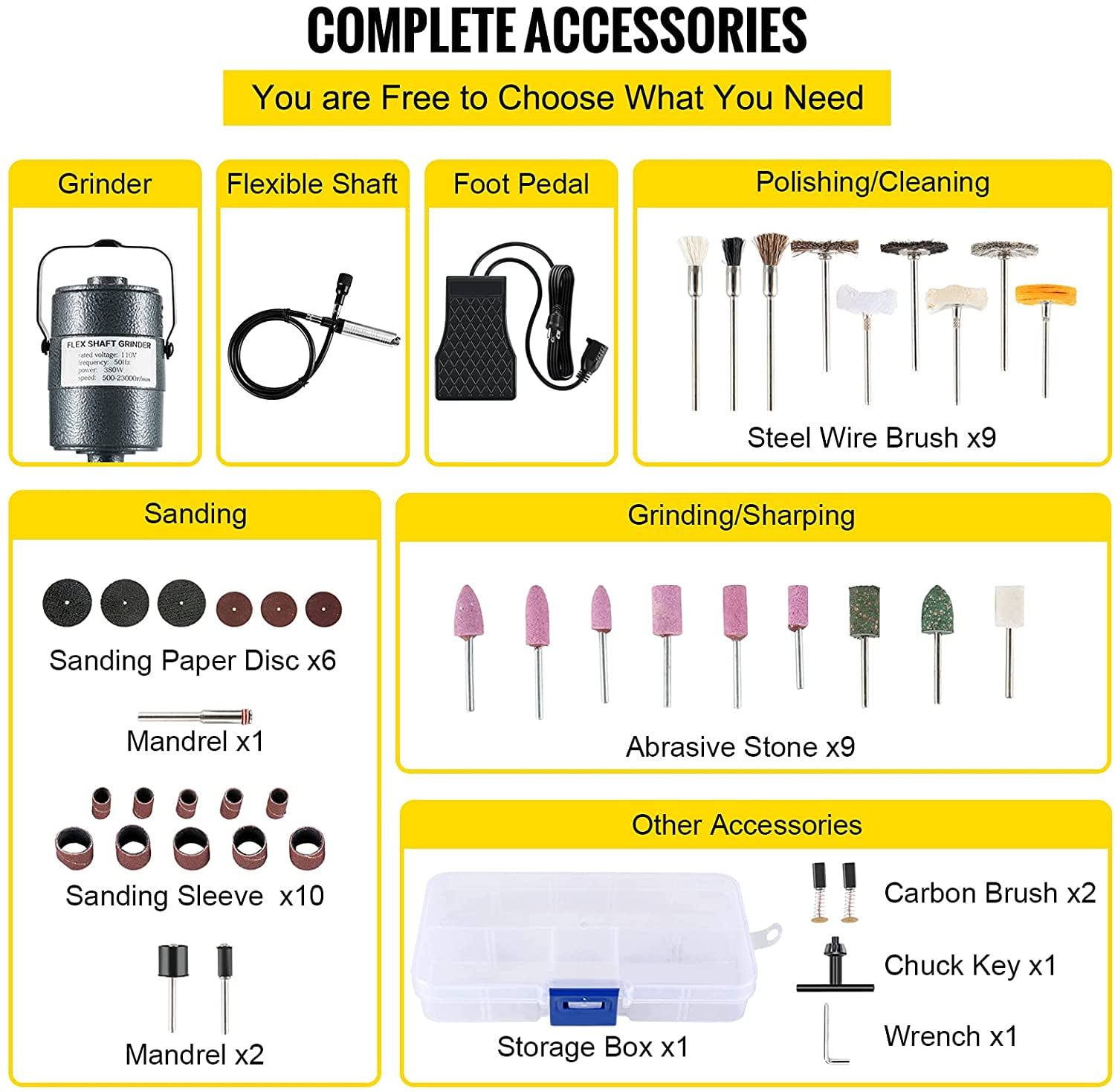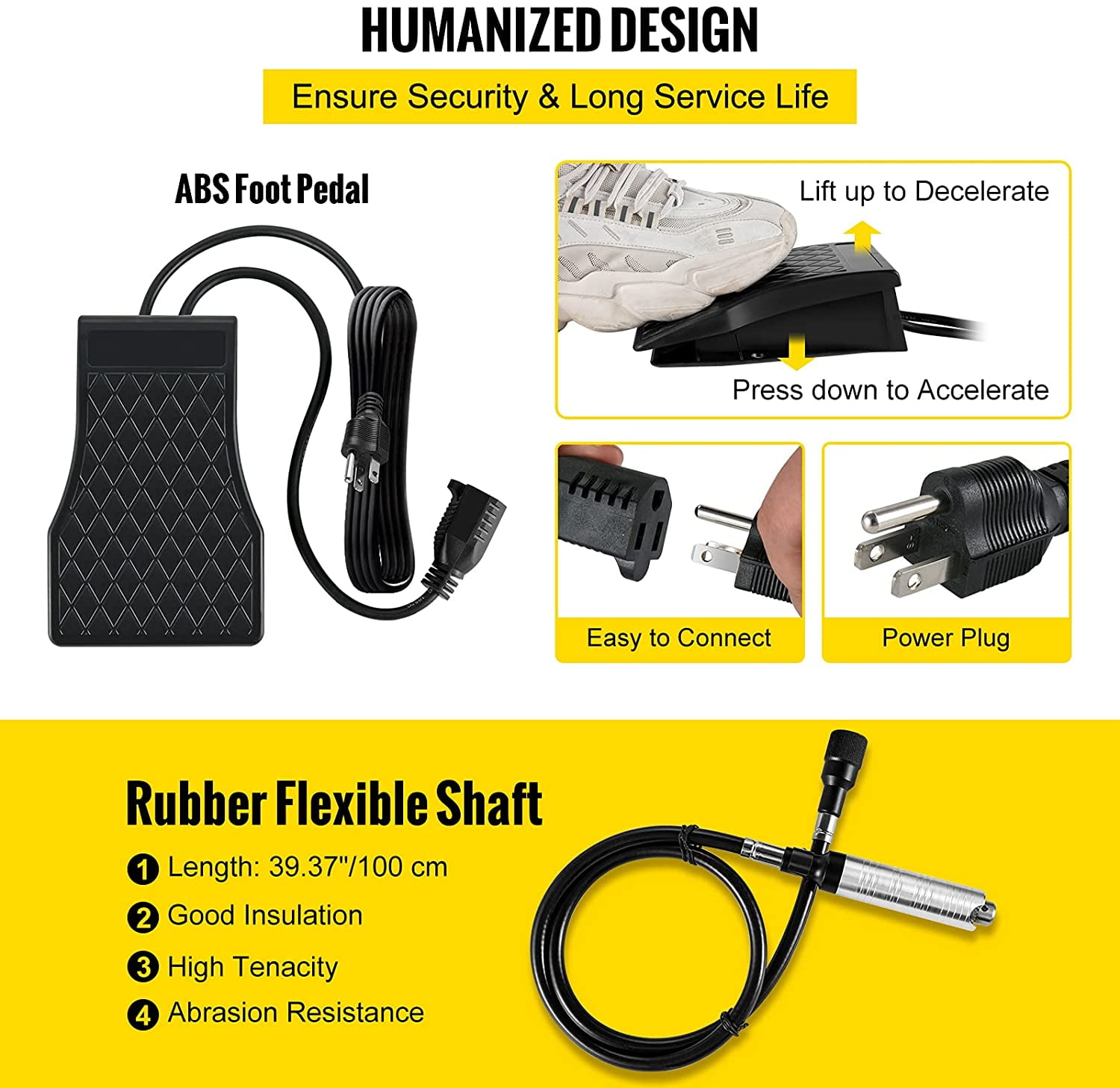 Brand Introduction VEVOR is a leading brand that specializes in equipment and tools. Along with thousands of motivated employees,VEVOR is dedicated to providing our customers with tough equipment & tools at incredibly low prices. Today, VEVOR has occupied markets of more than 200 countries with 10 million plus global members. Why Choose VEVOR? 1.Tough Quality Assurance 2.Incredibly Low Prices 3.Fast & Secure Delivery 4.30-Day Free Returns 5.24/7 Professional Customer Service Product Description 380W Flex Shaft Grinder Our flex shaft grinder comes with the complete accessory kit to perform numerous grinding, sanding, polishing, deburring, and cleaning tasks. With a strong copper motor, high-precision chuck, and variable speed foot pedal, the tool is suitable for different processing places and materials, such as metal, wood, stone, jewelry, etc. 380W Powerful Motor This powerful motor turns bits at high speed, delivering the performance you need for numerous tasks. With the external carbon brush port, you only need to unscrew the cover, pull out the old one, and then quickly replace the carbon brush, saving time and effort. High-precision Chuck Our three-jaw chuck enhances versatility by accepting accessories with a shank size up to 0.012″-0.26″/0.3-6.5 mm. In addition, it enables to accommodate a wide variety of fittings to accomplish various processing works. ABS Speed Foot Pedal The foot pedal adopts high-quality ABS plastic with durable solid-state electronics. Its ergonomic design allows precise & reliable speed control with your foot, keeping your hands and concentration on the works. Flexible Steel Shaft The flexible shaft is constructed of heavy-duty steel, more robust and durable than rubber, featuring high strength, heat resistance, and tenacity. Besides, its hanging design makes this tool easy to maneuver in your backyard, garage, or workshop. Complete Accessories We provide all kinds of rotary tool accessories to fulfill grinding, sanding, polishing, and cleaning requirements. Don’t worry. You can always find the one you need in the accessories bag. Specifications Model: 380W Flex Shaft Grinder Power: 380W Speed: 500-23000 RPM Voltage: 110V Chuck Type: Three-jaw Chuck Chuck Range: 0.012″-0.26″ / 0.3-6.5 mm Grinder Size: 3.15″ x 5.71″ / 80 x 145 mm Shaft Length: 39.37″ / 100 cm Foot Pedal Size: 4.53″ x 7.09″ / 115 x 180 mm Item Weight: 5.95 lbs / 2.7 kg Package Content 1 x 380W Flex Shaft Grinder 1 x Flexible Shaft 1 x Foot Pedal 9 x Steel Wire Brushes 9 x Abrasive Stones 6 x Sanding Paper Discs 3 x Mandrel 10 x Sanding Sleeves 2 x Carbon Brushes 1 x Storage Box 1 x Chuck Key 1 x Wrench