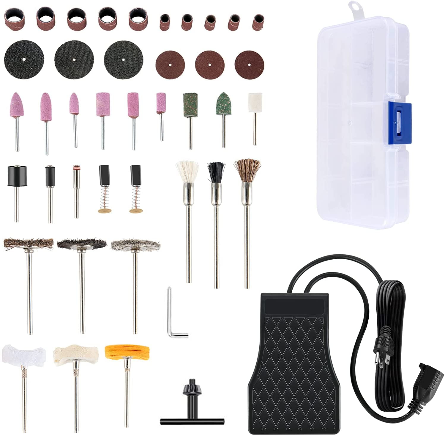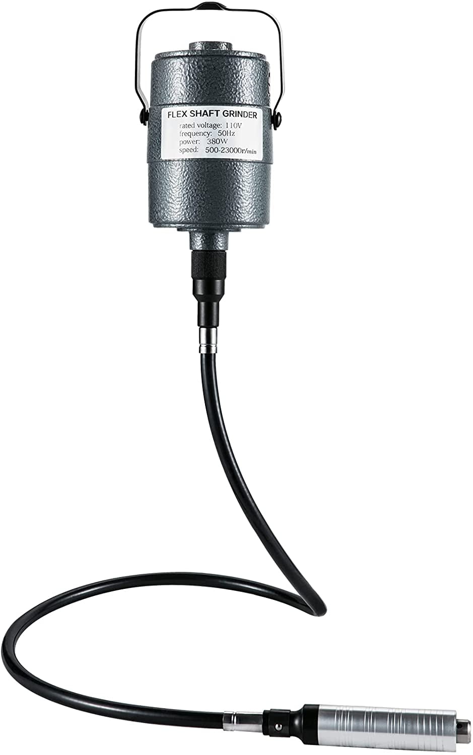 ã380W PURE COPPER MOTORã – The 380W pure copper motor provides a wide speed range of 500-23000 RPM for the flex shaft grinder with high stability and precision for elaborate work. It comes with a heat vent to keep the machine from overheating & burning to prolong its service life. ãTHREE-JAW CHUCK & SHAFTã – The flex shaft rotary tool has a high-precision 3-jaw chuck for higher compatibility and strong clamping force. Accessories ranging from 0.3-6.5 mm are suitable for the chuck to satisfy your different needs. And the flexible steel shaft with 100 cm length features good extension for precise connections. ãSTEPLESS SPEED FOOT PEDALã – The ABS plastic foot pedal for flex shaft hanging grinder is more secured than any metal variant due to its security-oriented material, which keeps from heat production or transfer. If you feel the speed adjustment is not very various, there is a screw on the pedal to adjust the constant speed and rotating speed. ãUSER-FRIENDLY ACCESSORIESã – There are 45 PCS rotary tool accessories for you to complete sanding, polishing, deburring and more. The steel wire brush, abrasive stone, sanding paper disc, mandrel, sanding sleeve, storage box, chuck key, and wrench are all available to improve your working efficiency. ãVERSATILE USE SCENARIOSã – Our 380W flex shaft carver is a professional rotary tool for finishing, polishing, adding textures, and reaching small spaces as well as delicate areas. It is suitable for different processing places and materials, such as metal, wood, stone, jewelry, etc.