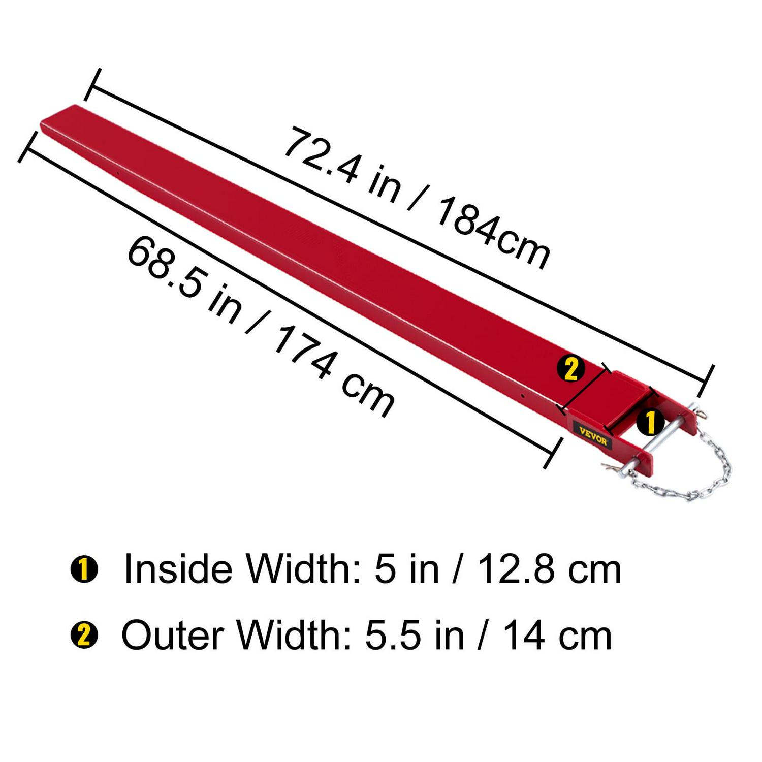 – Fit for 4.8 Inches Forklifts: The forklift extensions are suitable for 4.8″ width pallet forks. Overall Length: 72.4” / 184 cm, Usable Length: 68.5” / 174 cm, Inner Width: 5” / 12.8 cm, Outside Width: 5.5” / 14 cm. The extended length of the forks gives more space to lift multiple cargoes simultaneously. The large carrying capacity makes it possible to handle the most difficult lifting tasks in a warehouse or building site.
