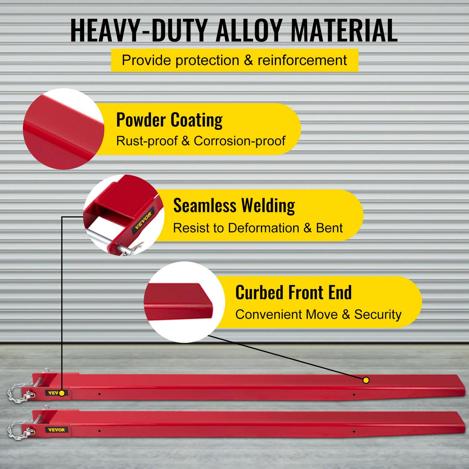 – Alloy Steel & Powder Coating: These fork extensions are made from high tensile steel, providing reinforcement to your equipment. Because of their heavy-duty steel construction and yellow powder coating, these extensions won’t rust or corrode, so you can enjoy them for years to come.