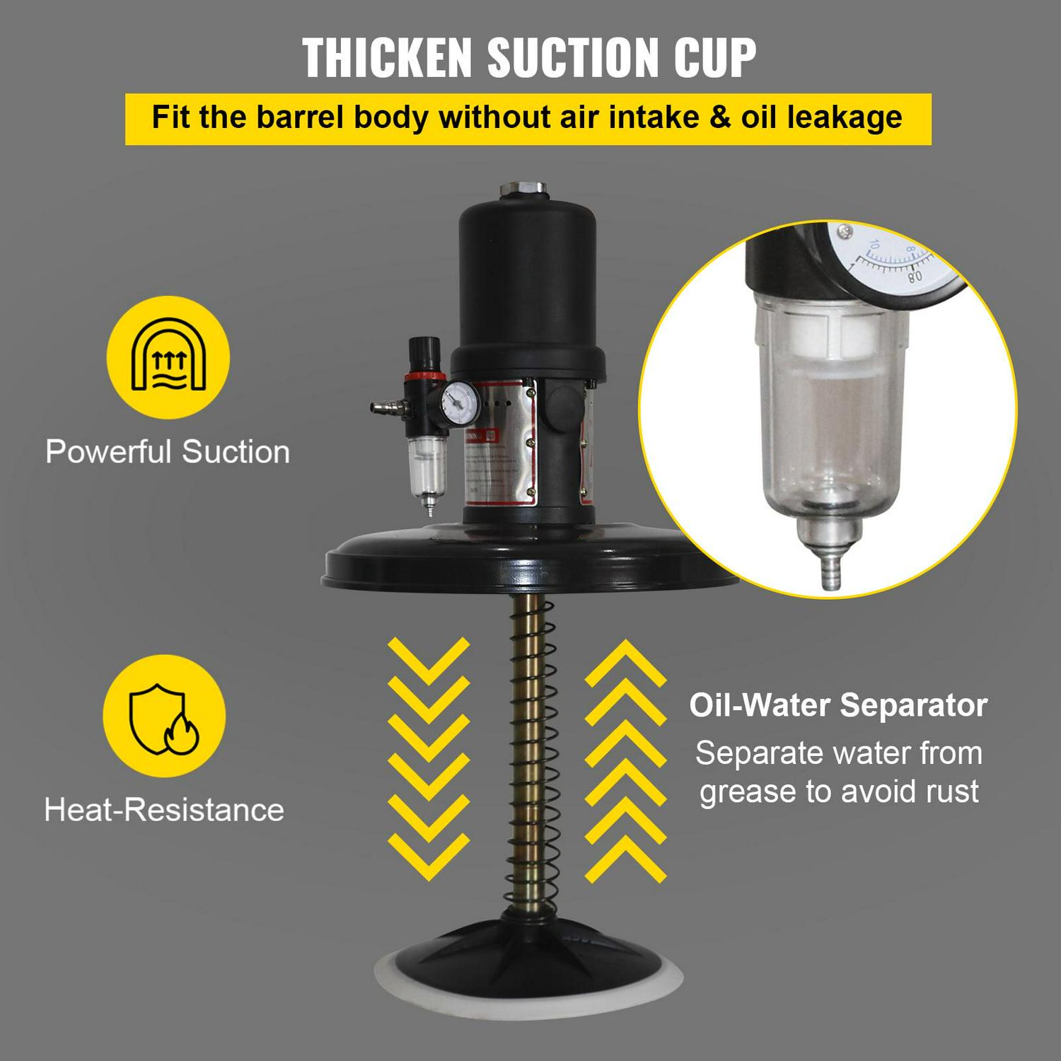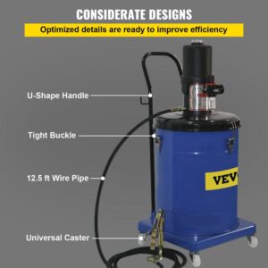 – EFFECTIVE DETAIL DESIGNS – The pneumatic grease pump is equipped with an inverted U-shaped handle and four rollers, easy to operate and transport. Low energy consumption, simple operation, and high efficiency. Moreover, buckles on both sides of the barrel are specially designed to ensure excellent sealing performance.