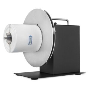 You can adjust the rewinding speed or choose to synchronize the speed with the printer. You can loosen and tighten the black lock levers to lock the cardboard core. A handle is for portability.