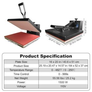 – 16 x 20 Heat Press: The larger heating pad, 16 x 20 in / 40.6 x 51 cm, adopts silica-gel and sponge, reaching a service life of 20,000 hours. Deliver a quicker heating speed and a better transfer effect. Soft heating liner is applied for accommodating various kinds of materials. It can also reduce unpleasant smells during operation.