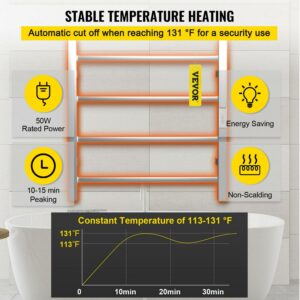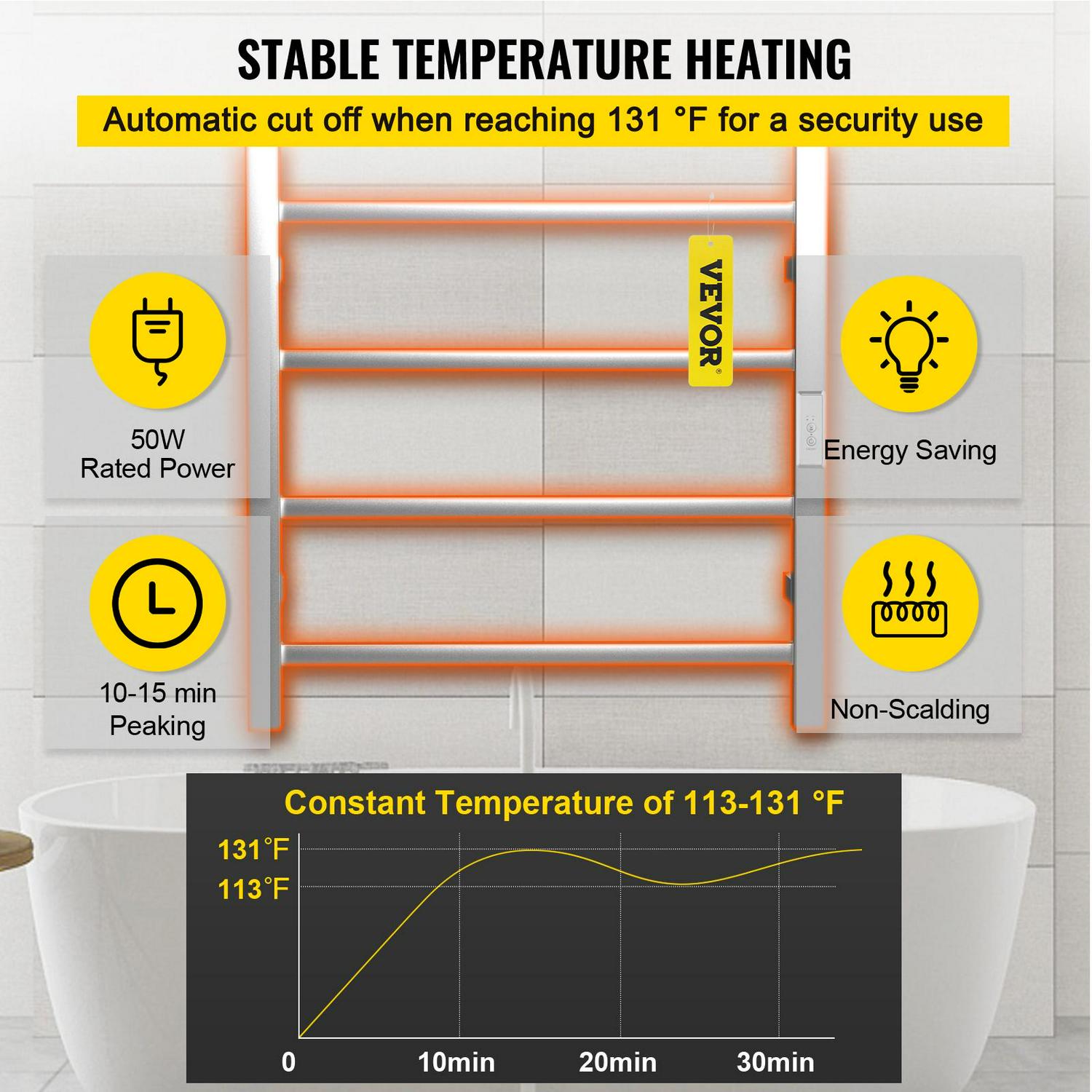 – Fast Heating & Overheat Protection: Heating Power: 55 W. The towel warmer rack is better for warming clothes and keeps a proper and stable temperature between 113-131 °F. With no more than 15 minutes can the rack reaches the peaking temp. of 131 °F, and then automatically stops heating for security use. No worries about the accidental touch because of its non-scalding feature.