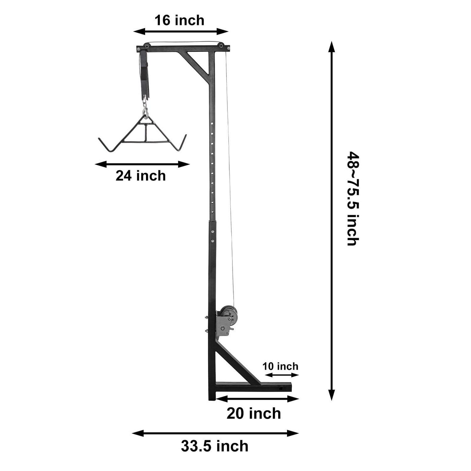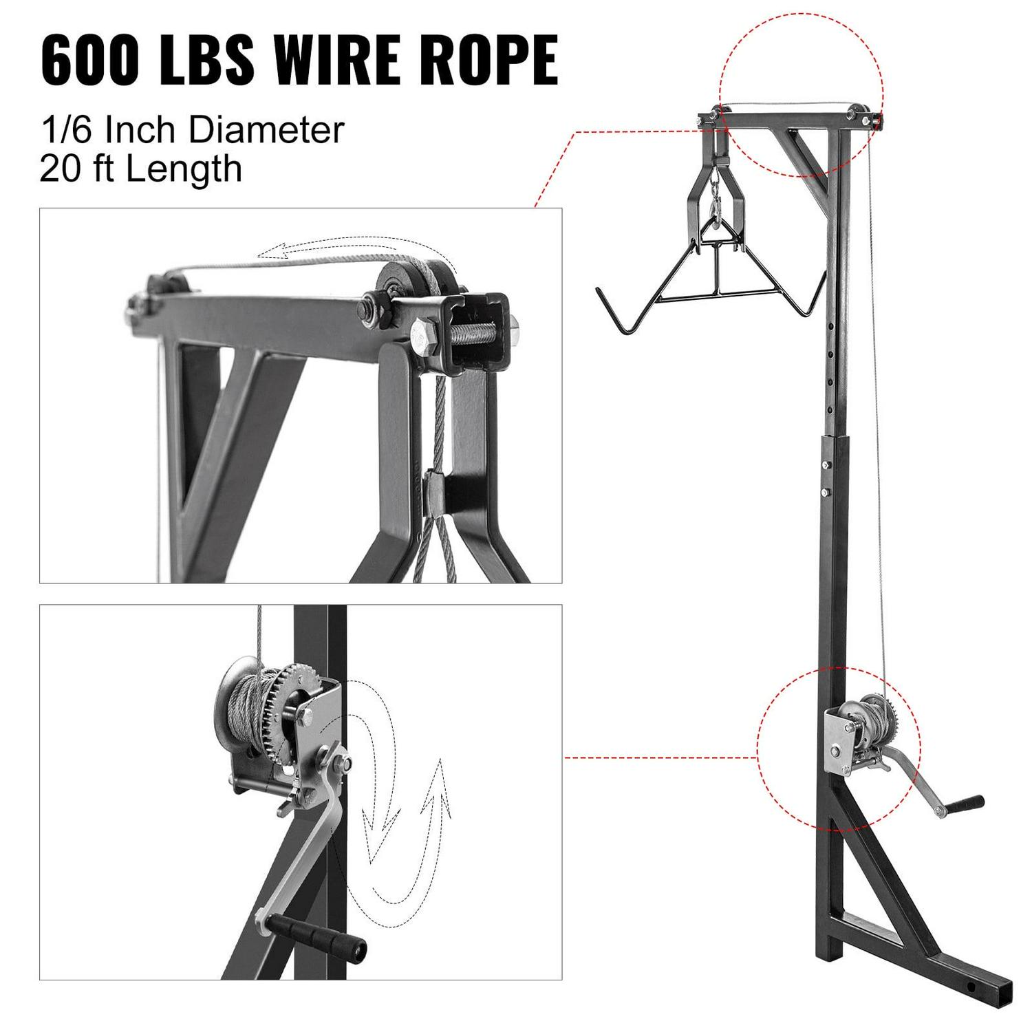 – ADJUSTABLE DESIGN – Adjustable height: 48”~75.5”. This hitch deer hoist is tall enough to get the larger game into your truck, including a 24″ gambrel and 600 lbs wire lift winch. Winch cable: 1/6” x 20 ft.