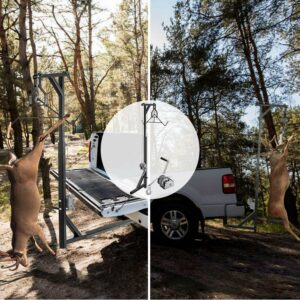 – EASE OF USE – Fits your 2″ truck receiver hitch. Easy setup in few minutes, and lift the big game with the winch cable set and gambrel, get the game into/off the truck, then you’re ready to process your game.