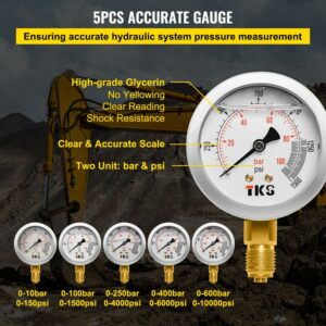 – Sturdy & Durable Gauge: The hydraulic gauges adopt a 304 stainless steel shell and copper screw joint, making the gauge sturdy and durable for long service life. High purity glycerin filled in the gauge; effectively reduces the affection of vibration and pulsation.