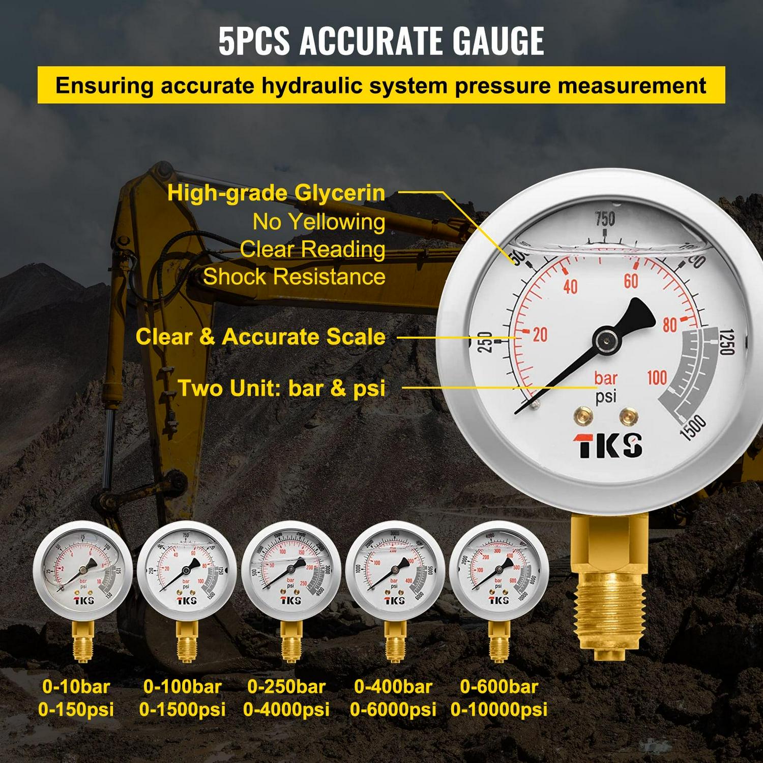 This hydraulic test kit comes with five pressure gauges of different ranges: 0-10bar/100bar/250bar/400bar/600bar. The glycerin remains clear and transparent and will not turn yellow after a long time of use.