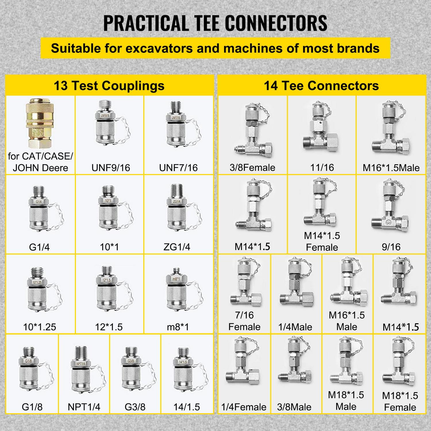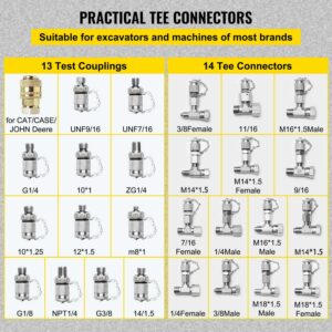 This hydraulic gauge kit has 13 test couplings and 14 tee connectors, which fit most excavators. These couplings connect easily and fit appropriately due to the advanced design.