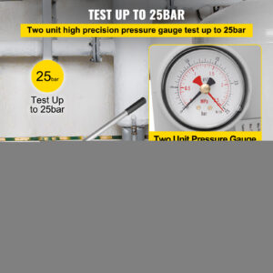 – 25bar Two-Unit Gauge: This pressure test pump has a wide test range, testing up to 25 bar/2.5 MPa. The precise gauge displays the dependable pressure figure in two units: bar/MPa. Also designed with two pointers distinguished by black and red for easy reading.