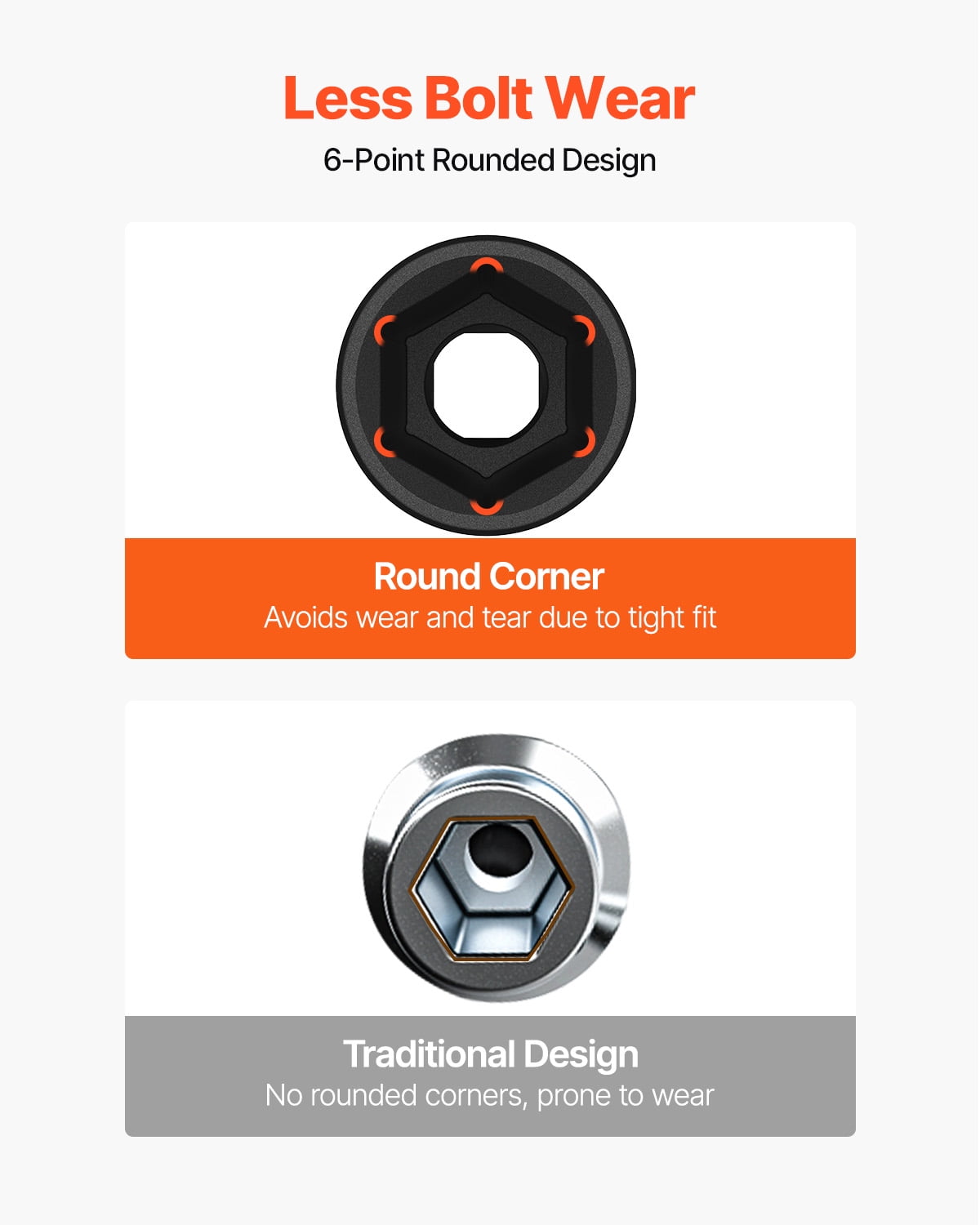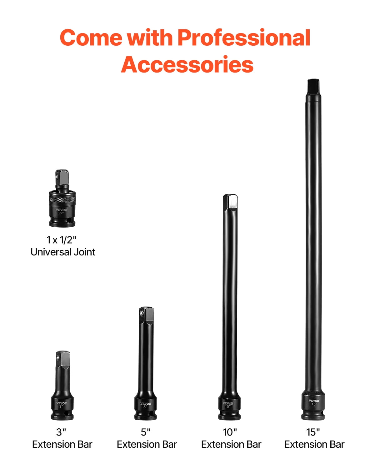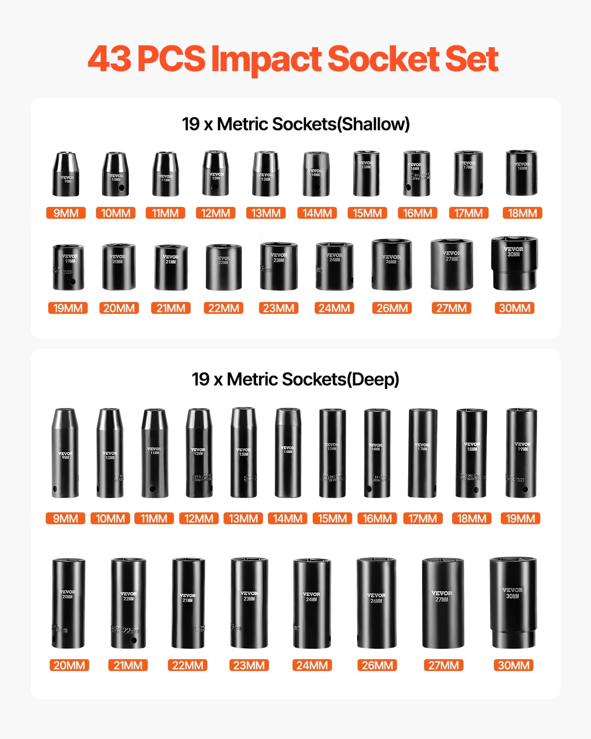 Brand Introduction VEVOR is a leading brand that specializes in equipment and tools. Along with thousands of motivated employees, VEVOR is dedicated to providing our customers with tough equipment & tools at incredibly low prices. Today, VEVOR has occupied markets of more than 200 countries with 10 million plus global members. Why Choose VEVOR? 1.Tough Quality Assurance 2.Incredibly Low Prices 3.Fast & Secure Delivery 4.30-Day Free Returns 5.24/7 Professional Customer Service Product Description1/2 Inches Drive Impact Socket Set The impact socket set features a 6-point, high-torque design that contacts and grips the stronger flat sides of nut or bolt head, not the weaker corners, preventing stripping or rounding off under high stress. It also comes with a special customized heavy-duty case to provide you easier storage. Rugged Construction The Impact socket pieces are constructed of heavy-duty chrome vanadium steel, which is anti-oil and anti-rust, to withstand extreme levels of torque changes against fasteners. 6-Point Hex Socket Design This 6-point socket design grips flat sides of fasteners rather than the corners to offer security and prevent stripping and rounding off bolt corners. Easy-to-Read Size Markings Our extra-large size markings are permanently etched onto our every socket, so, even in low light, you don’t have to waste a lot of time identifying the size you need. 38 Sockets Included This effort-saving 1/2” drive impact socket set comes with 19 standard sockets: 9mm, 10mm, 11mm, 12mm, 13mm, 14mm, 15mm, 16mm, 17mm, 18mm, 19mm, 20mm, 21mm, 22mm, 23mm, 24mm, 26mm, 27mm, 30mm and 19 deep sockets: 9mm, 10mm, 11mm, 12mm, 13mm, 14mm, 15mm, 16mm, 17mm, 18mm, 19mm, 20mm, 21mm, 22mm, 23mm, 24mm, 26mm, 27mm, 30mm. Sturdy Storage Case The set comes with a customized heavy-duty case for portability. Designated slots in the case keep every piece in place. Sizes are also stamped beside each slot for easy identification and organized storage. Wide Application This torque multiplier truck is perfect for removing and installing wheel lug nuts, particularly suitable for most trucks, RVs, and other heavy-duty vehicles. Specifications Material: CR-V Drive Size: 1/2 inches Extension Bar: 3”, 5”, 10”, 15” Standard Sockets: 9mm, 10mm, 11mm, 12mm, 13mm, 14mm, 15mm, 16mm, 17mm, 18mm, 19mm, 20mm, 21mm, 22mm, 23mm, 24mm, 26mm, 27mm, 30mm. Deep Sockets: 9mm, 10mm, 11mm, 12mm, 13mm, 14mm, 15mm, 16mm, 17mm, 18mm, 19mm, 20mm, 21mm, 22mm, 23mm, 24mm, 26mm, 27mm, 30mm. Package Content 38 x 6-Point Sockets: 9-30mm (Standard/Deep) 4 x Extension Bars 1 x Universal Joint 1 x Carrying Case