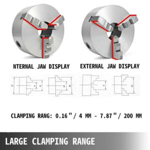 – 2 SETS OF JAWS – This chuck includes two sets of internal and external jaws. The clamping range of this chuck is between 0.16″ / 4 mm – 7.87″ / 200 mm, which is suitable for clamping a variety of industrial parts.