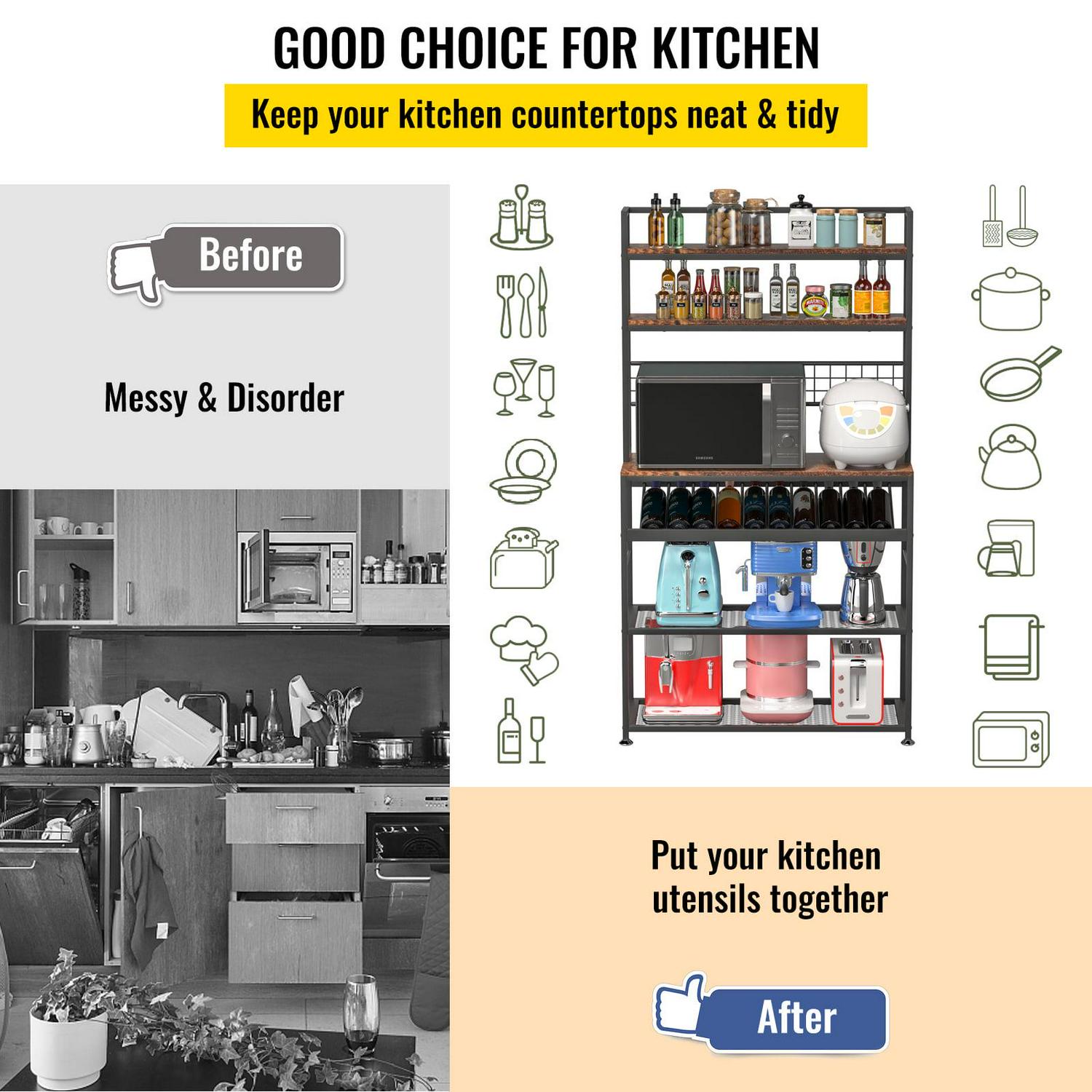 – Store Items Everywhere: Not only can the kitchen baker make your kitchen look tidier, you can also put it in any room at home. It can be used as a bread rack, microwave oven rack, coffee rack, and bathroom rack to add more storage space for the bedroom, kitchen, pantry, or bathroom. Its industrial style design can be well integrated with various home decor styles. Elevate your home appearance and enjoy more space.