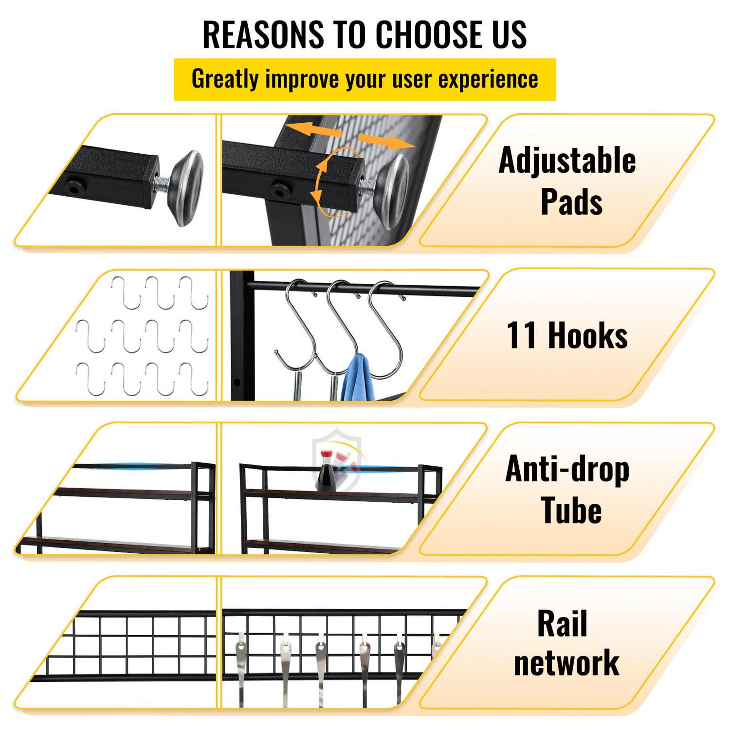 – User-Friendly Design: The height of the four feet can be adjusted effortlessly. 10 hooks for hanging cooking tools, rags, etc. are considerately provided. Additionally, an anti-falling pole can prevent spices and other items on the upper layer from falling.