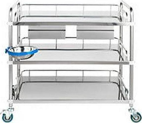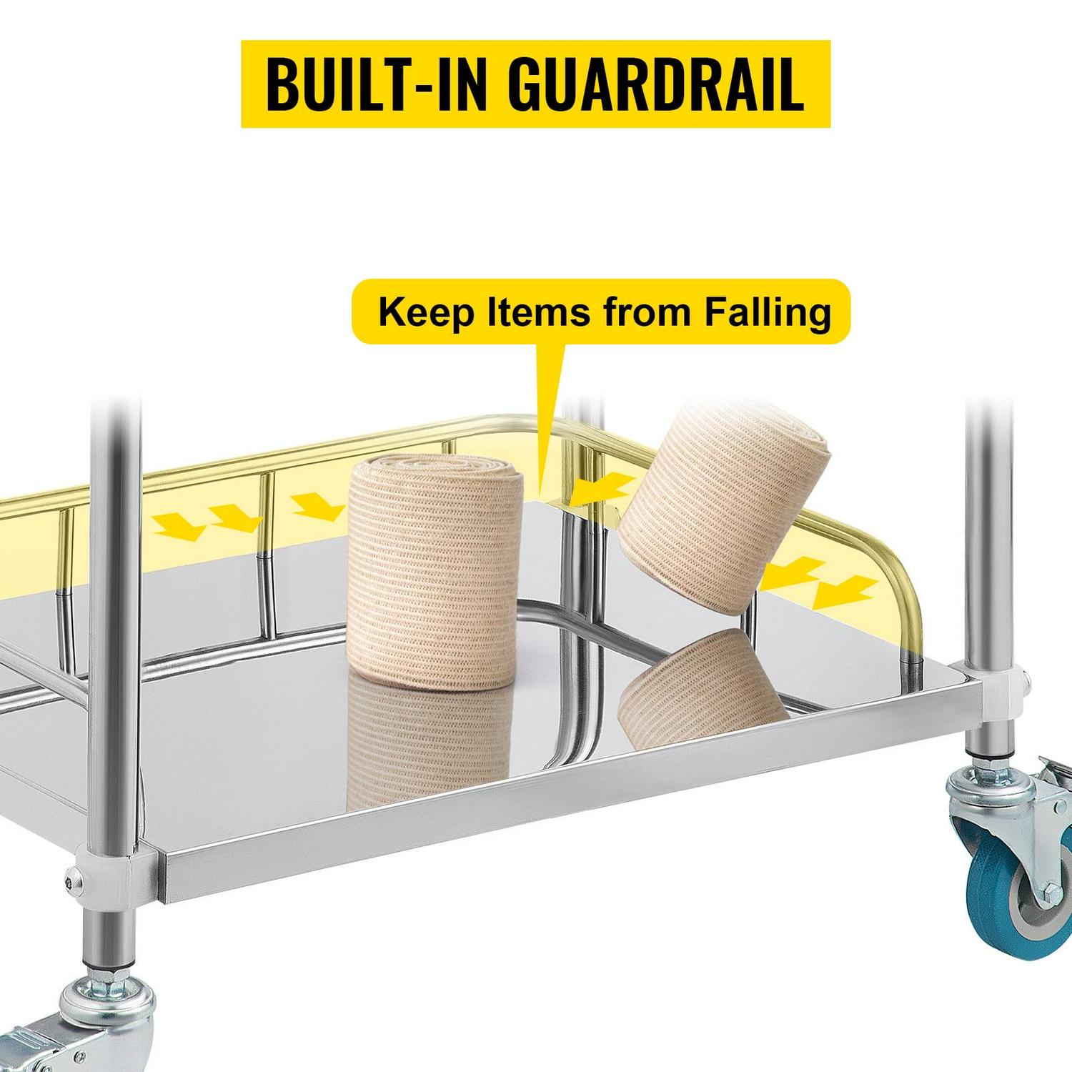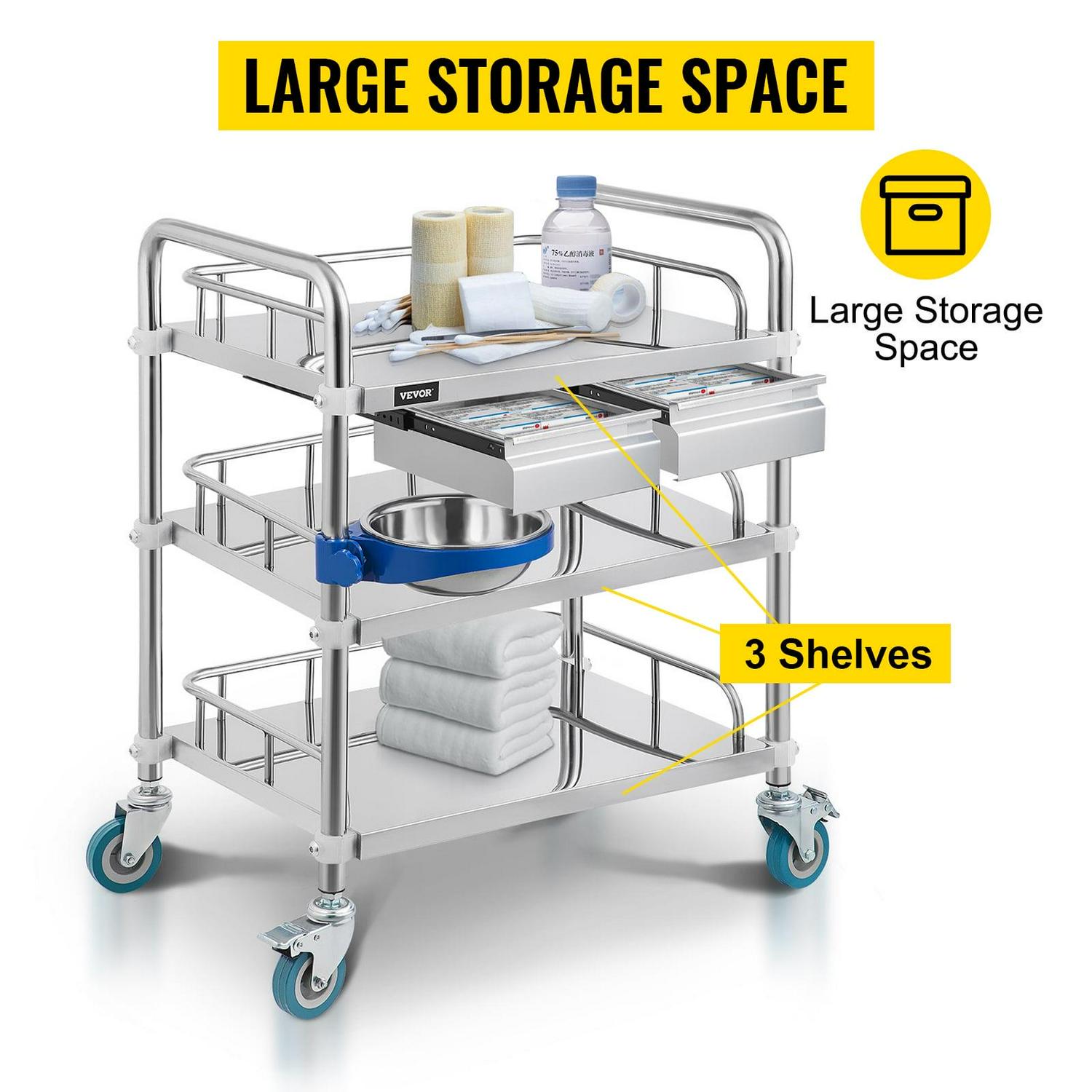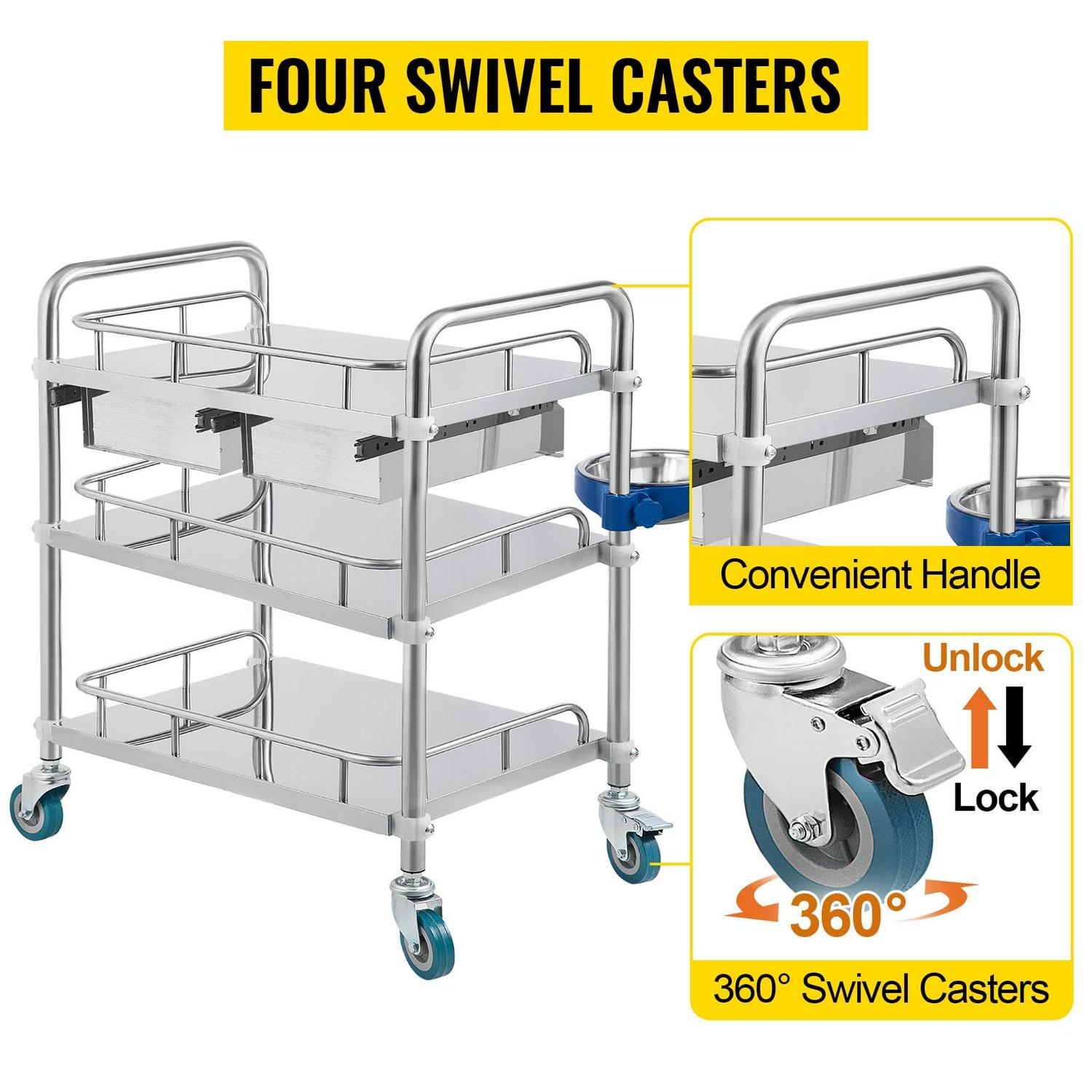 VEVOR 3-layer lab cart is fabricated with superior quality 304 stainless steel with better resistance to corrosion and rust. The pushrod is comfortable to grab, and the guardrails permit secure transport. Designed with one refuse basin, two easy-to-pull drawers, and four lockable universal wheels, this functional cart is ideal for any condition when you need transportation.