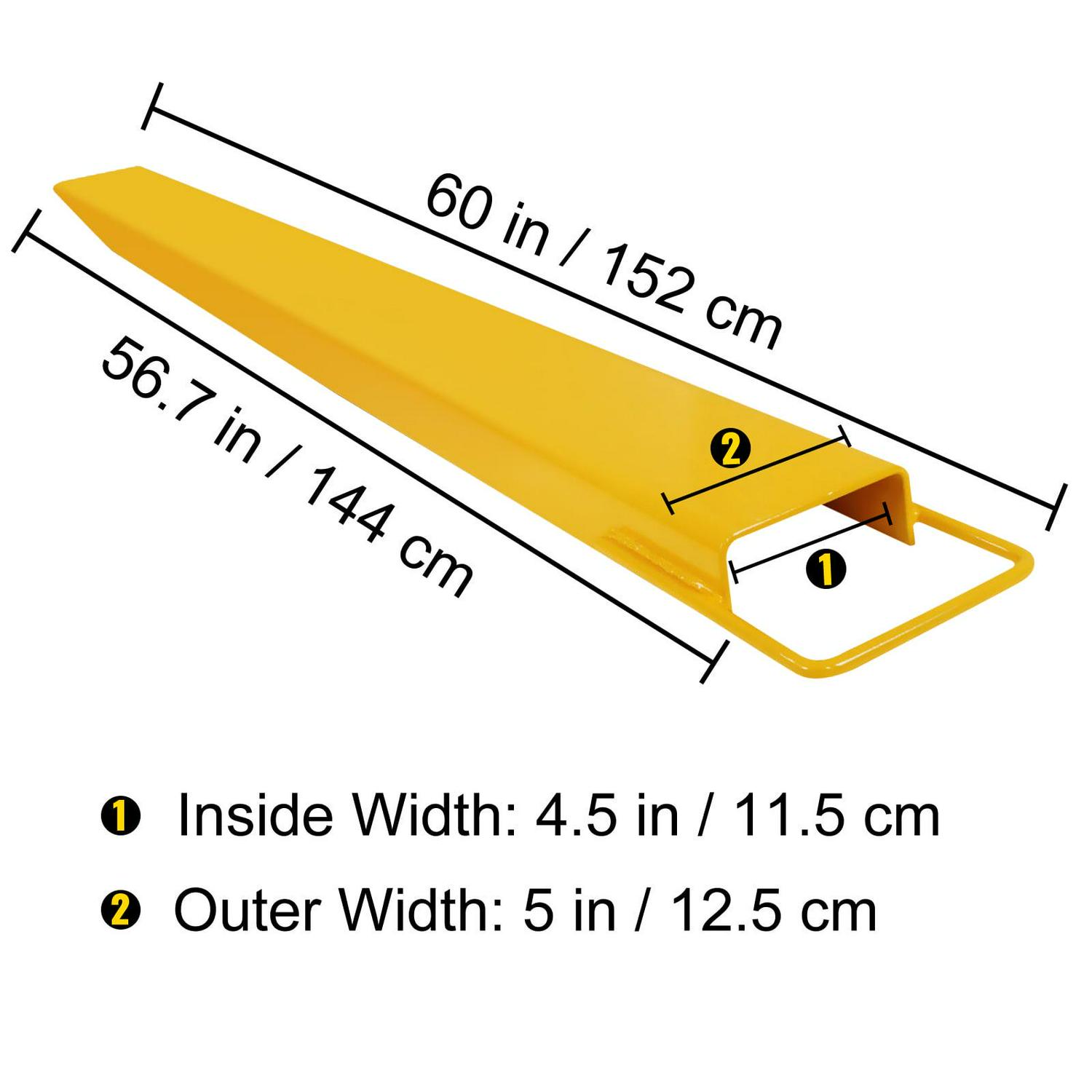 – FIT FOR 4.3 INCHES FORKLIFTS – The forklift extensions are 60” in length, 4.5” in inside width, ideally suitable for 4.3″ width pallet forks. They extend the size of the original forks, giving more space to fork cargoes at one time. The large weight capacity makes it capable of undertaking most lifting tasks in a warehouse or building site.