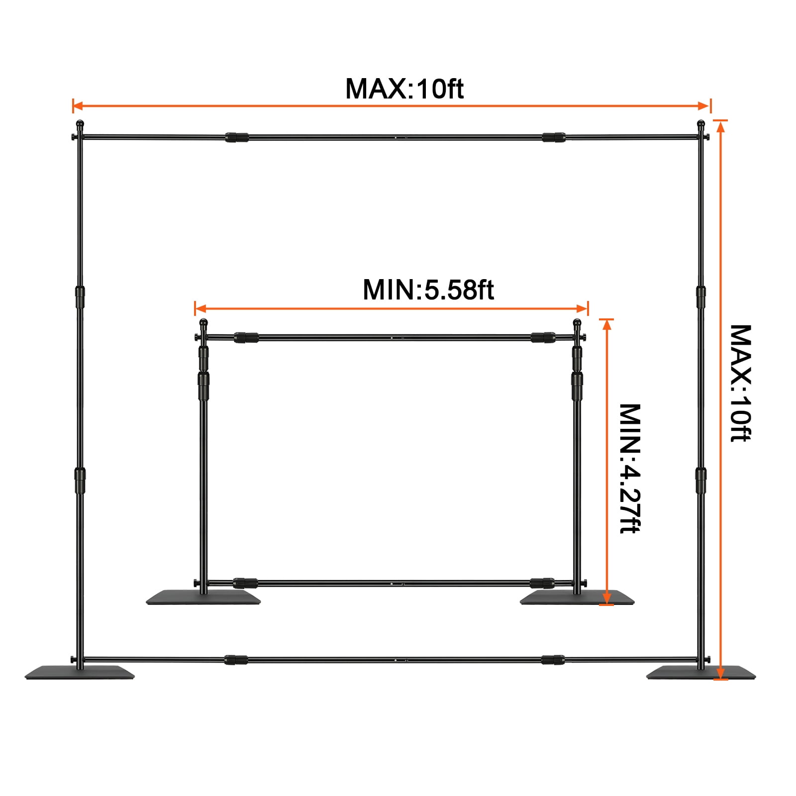 Flat Carbon Steel Base: To provide reliable support, our pipe and drape kit features a carbon steel base, ensuring stability and durability with a max loading capacity of up to 11 lbs. The thickened φ 1.4″ telescopic crossbars further enhance the stability. Perform well in various application scenarios. Adjustable Sizes: Our heavy-duty backdrop stand features multiple size adjustment options. The support pole height ranges from 3.3 ft to 10 ft. Meet your various creation needs! Multi-Functional Clamps: Our pipe and drape stand system comes with 2 heavy-duty spring clamps, capable of securely clamping anything to the support pipes, ensuring a tight and wrinkle-free backdrop. The multi-functional clamps work perfectly with the stand to deliver the best shooting results. Portable and Easy Setup: The background support allows for quick assembly and disassembly, saving you time and effort. This enables you to create a perfect photography backdrop anytime, anywhere. Whether you’re a professional photographer or a photography enthusiast, effortlessly achieving professional photography. Versatility Usages: Our versatile backdrop stand provides a multifunctional photography backdrop solution. Whether you need a professional studio backdrop, wedding, DIY photo booth, party decoration, and more, it can meet your requirements. Show your limitless creativity on it.