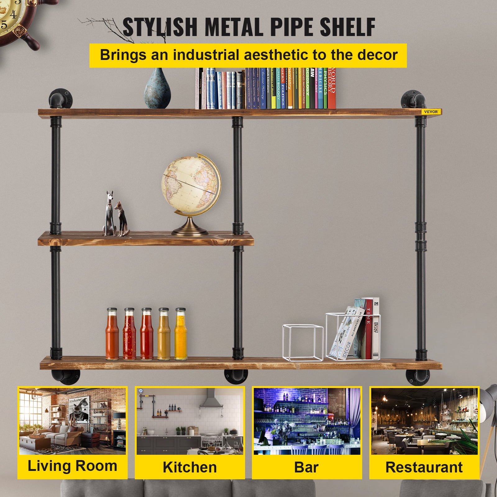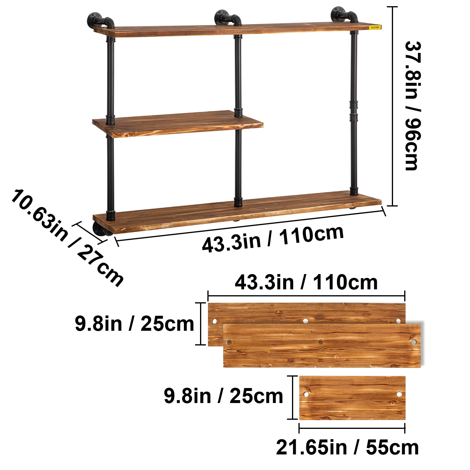 Brand Introduction VEVOR is a leading brand that specializes in equipment and tools. Along with thousands of motivated employees,VEVOR is dedicated to providing our customers with tough equipment & tools at incredibly low prices. Today, VEVOR has occupied markets of more than 200 countries with 10 million plus global members. Why Choose VEVOR? 1.Tough Quality Assurance 2.Incredibly Low Prices 3.Fast & Secure Delivery 4.30-Day Free Returns 5.24/7 Professional Customer Service Product Description Wall-Mounted Metal Pipe Shelves 3-Tiers & 20 mm Plank Thickness & Steel Retro Rustic Design This stylish pipe shelving comes with industrial steel pipe brackets and solid log planks. It is going to add an industrial aesthetic to your home decor. DIY Versatile Pipe Shelves It is very sensible to install these industrial pipe shelves with wood planks in your kitchen and bathroom to help you store condiments, toiletries, and other daily items. Metal Construction These pipe shelves feature high-quality steel and a thickened base for greater load-bearing capacity and longer service life. In addition, the seamless welding technology makes it have an excellent waterproof ability. High-Quality Solid Wood These solid log planks have a natural grain, paint protection, and the right thickness for good water resistance and easy cleaning. So, you can use it indoors and outdoors with confidence. Easy to Install The installation of this industrial pipe shelving is not tricky. Once you have all the tools ready, follow our installation steps to complete the installation in no time. Widely Used These beautiful and practical industrial wall shelves are suitable for living room, kitchen, bar, dining room, and other places to decorate the environment and store and display some small objects. Specifications Model: VV-CWJ-014 Color: Brown Material: Steel, Solid Wood Layers of Planks: 3 Board Thickness: 0.8 in / 20 mm Plank Size A: 43.3×9.8 in / 110×25 cm Plank Size B: 21.65×9.8 in / 50×25 cm Pipe Diameter: 1 in / 25 mm Item Size: 43.3×10.63×37.8 in / 110x27x96 cm Package Weight: 26.68 lbs / 12.10 kg Package Content 1 x Pipe Shelf System
