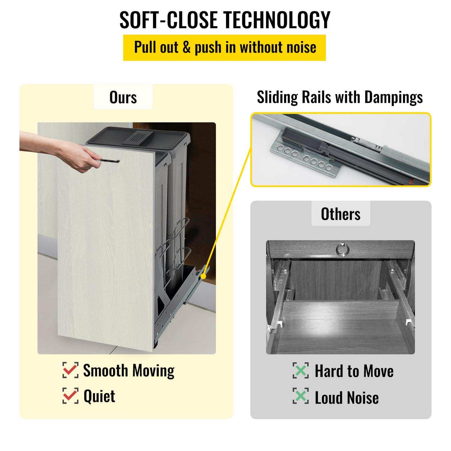 – Soft-Closing Slides: This under-counter pull-out trash can adopts soft-close technology. Due to the premium sliding rails with dampings, you can slide in or out the trash bin smoothly and quietly without any obstacles, and you won t have to keep readjusting the bin. In this way, it makes the process of throwing waste easy and comfortable.