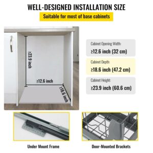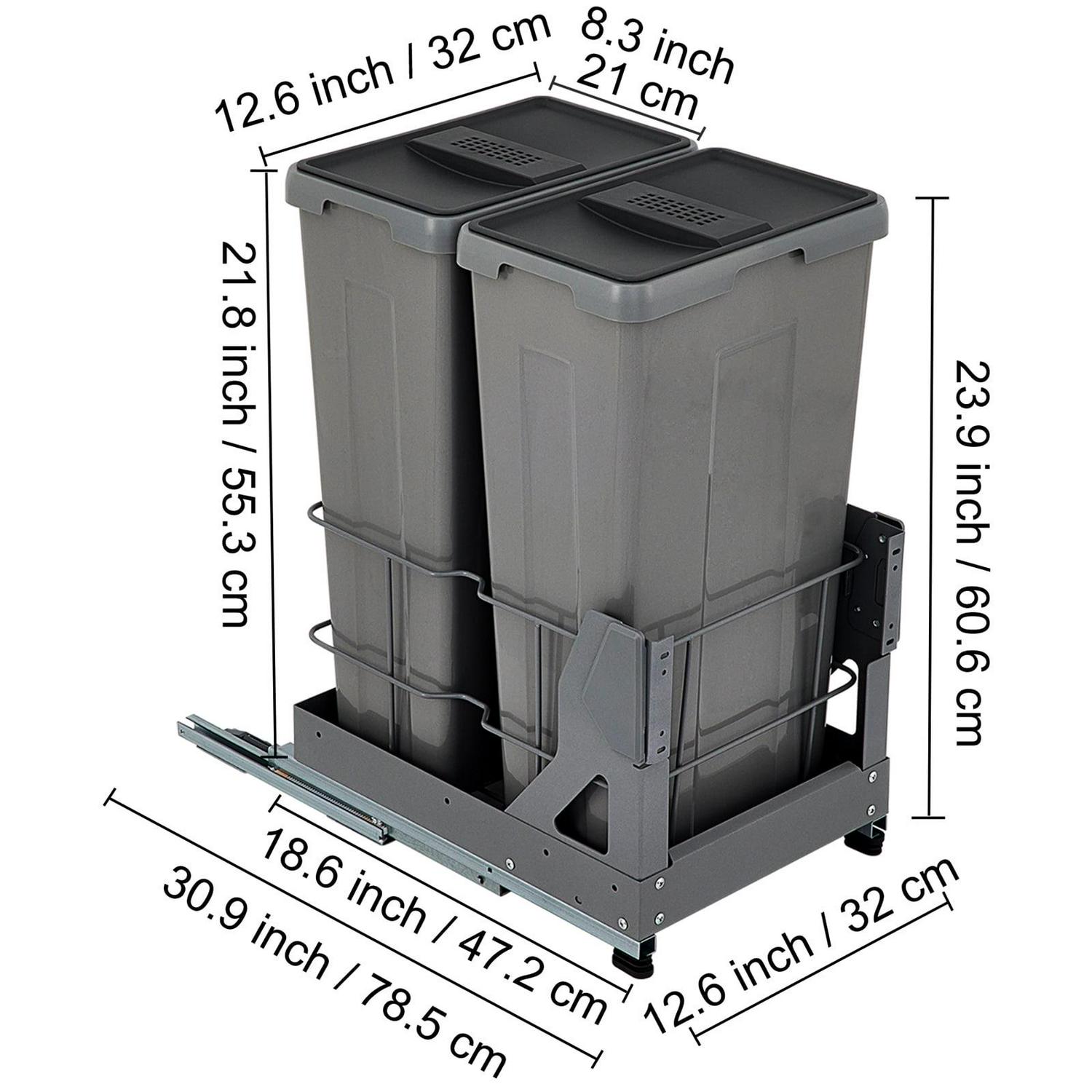 VEVOR Pull-Out Trash Can, 29Qt Double Bins, Under Mount Waste Container with Soft-Close Slides, 66 lbs Load Capacity and Door-Mounted Brackets, Garbage Recycling Bin with Lids for Kitchen Cabinet, Grey