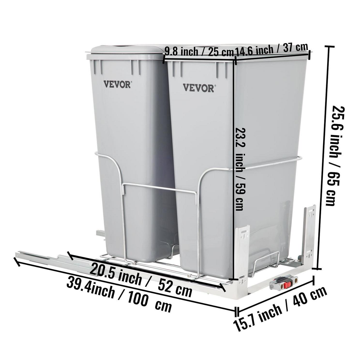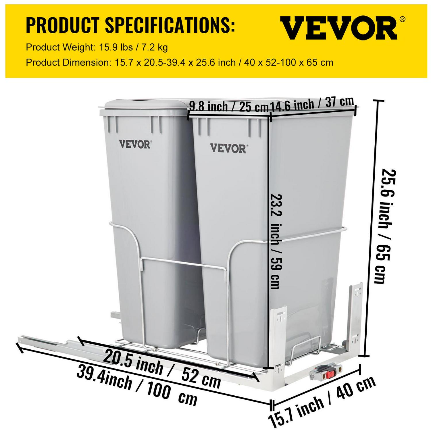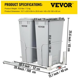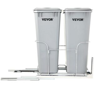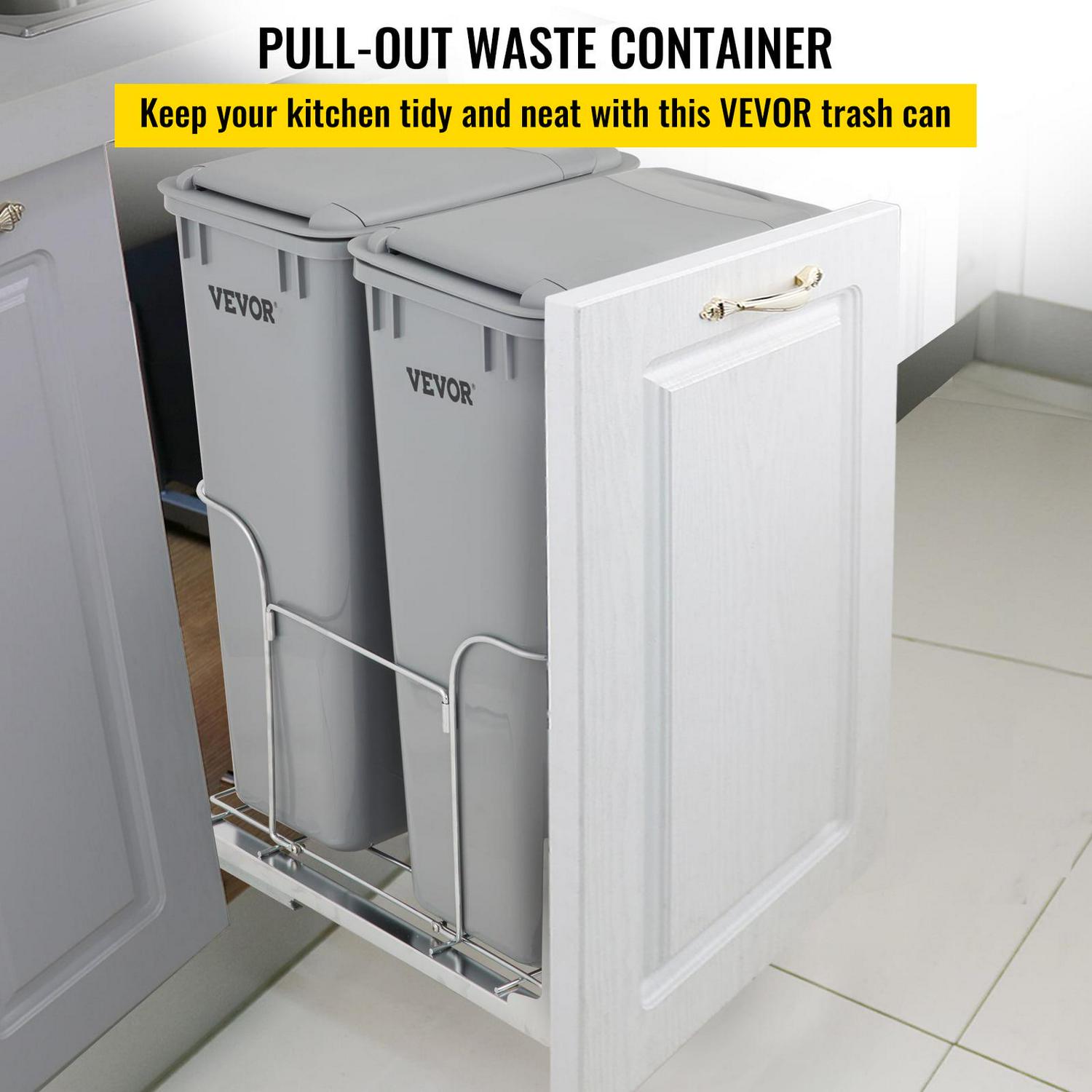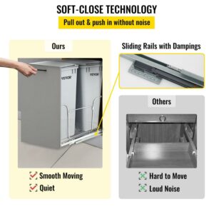 VEVOR Pull-Out Trash Can, 43Qt Double Bins, Under Mount Waste Container with Soft-Close Slides, 176 lbs Load Capacity and Door-Mounted Brackets, Garbage Recycling Bin with Lids for Kitchen Cabinet, Grey