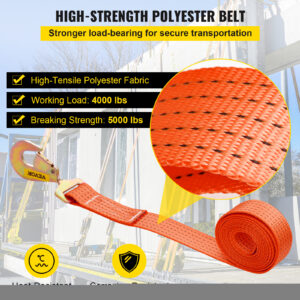 This ratchet belt is very suitable for tightening heavy cargos in transportation thanks to its large working load capacity of 4000 pounds (1.81 ton) and breaking strength of 5000 pounds (2.27 ton).