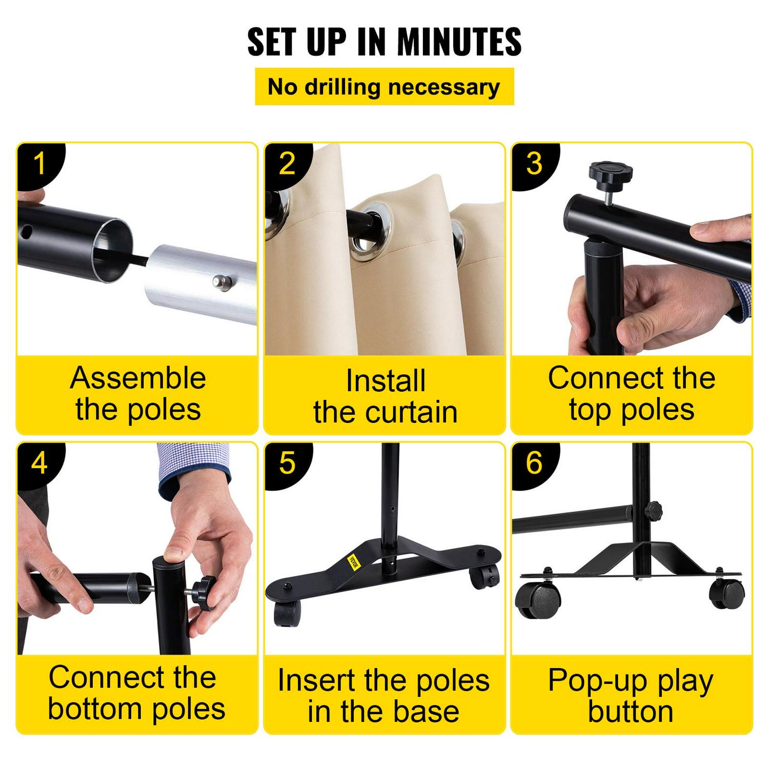 You can set up the portable office walls dividers in minutes. With the rubber band in poles, you can quickly assemble it: At first, assemble the poles and curtain, then connect the top and bottom poles, finally insert the poles in the base.