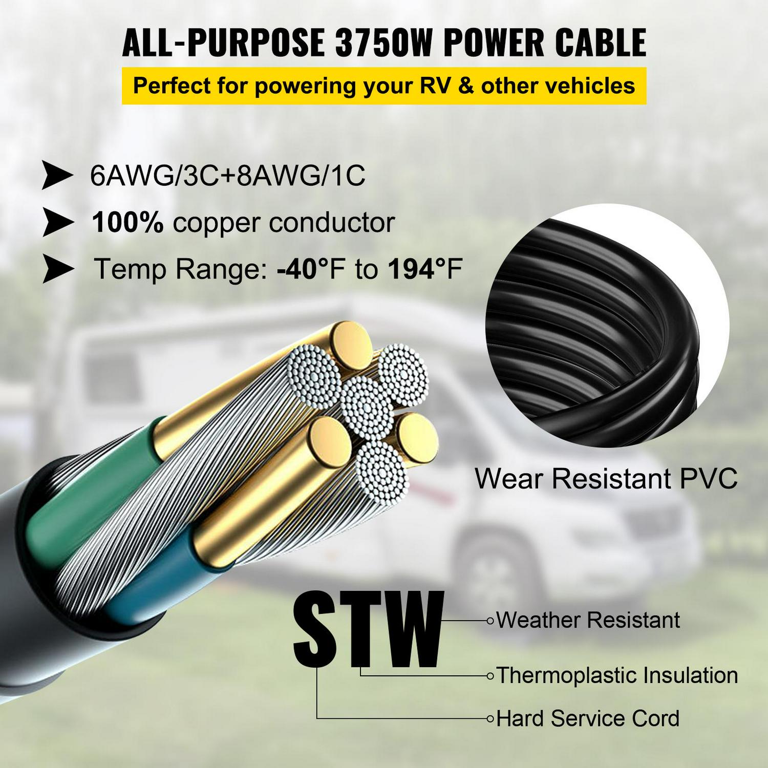 VEVOR RV Shore Power Extension Cord 36FT 50 AMP Weatherproof Heavy Duty 6/3 + 8/1 STW Twist Lock Cord 50 Amp RV Replacement Cord UL and CSA Approved W/Molded Connector and Patented Handle