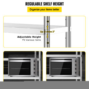 – STURDY MATERIAL – Kitchen shelving, made of thickened stainless steel with brushed surface. The thickness of material is 0.02″ (0.5mm). Anti-rust, anti-corrosion and easy cleaning.