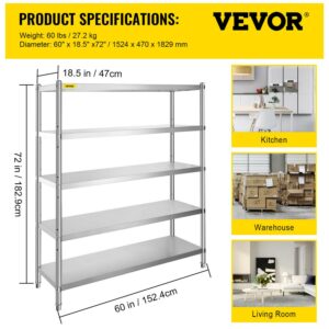 VEVOR Stainless Steel Shelving 60×18.5 inch 5 Tier Adjustable Shelf Storage Unit Stainless Steel Heavy Duty Shelving for Kitchen Commercial Office Garage Storage 330lb Per Shelf