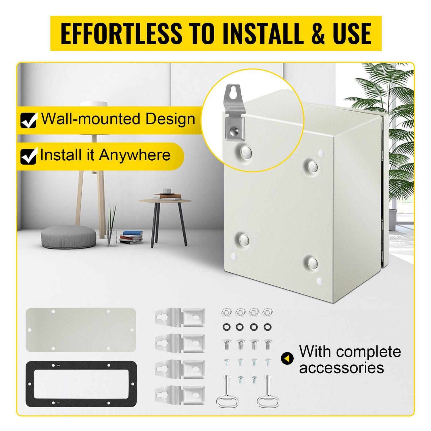 – CONVENIENT INSTALLATION – The metal enclosure box is equipped with a removable galvanized mounting backplate to facilitate installing the electrical components. Complete accessories and four wall mounting holes in the back make it easy to fix the wall’s electrical box.