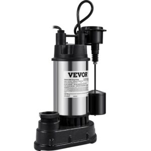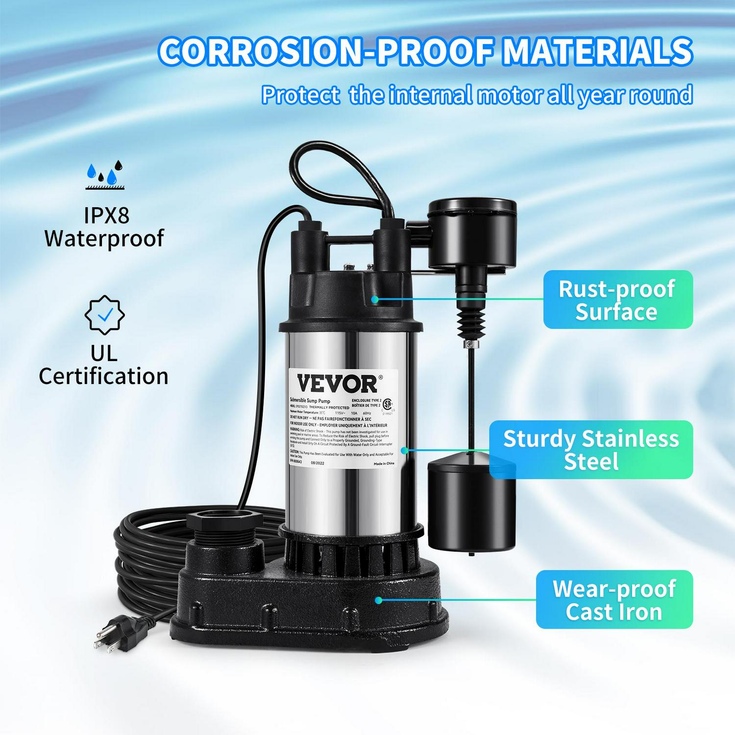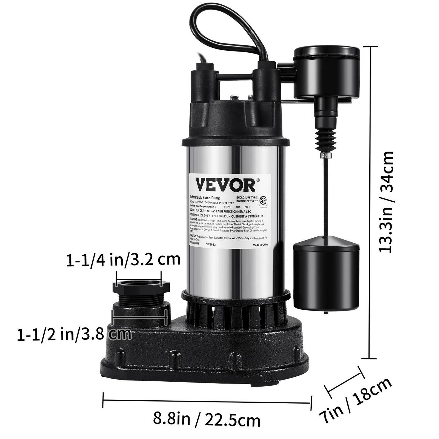 VEVOR Sump Pump, 1.5 HP 6000 GPH, Submersible Cast Iron and Stainless Steel Water Pump, 1-1/2 Discharge With 1-1/4 Adaptor, Automatic Vertical Float Switch, for Indoor Basement Water Basin