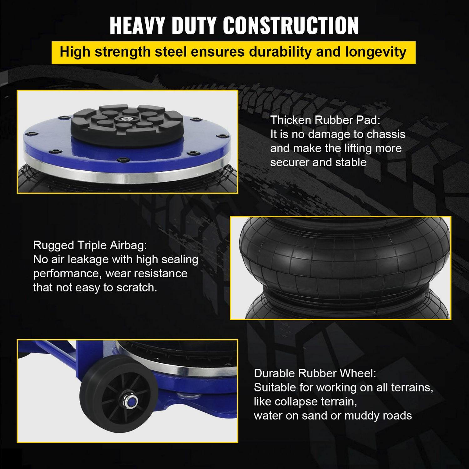 – HEAVY DUTY CONSTRUCTION- The pneumatic jack is made of high strength steel, the whole body is sturdy and durable. Larger stressed area, fits on soft and easy-collapsing place.