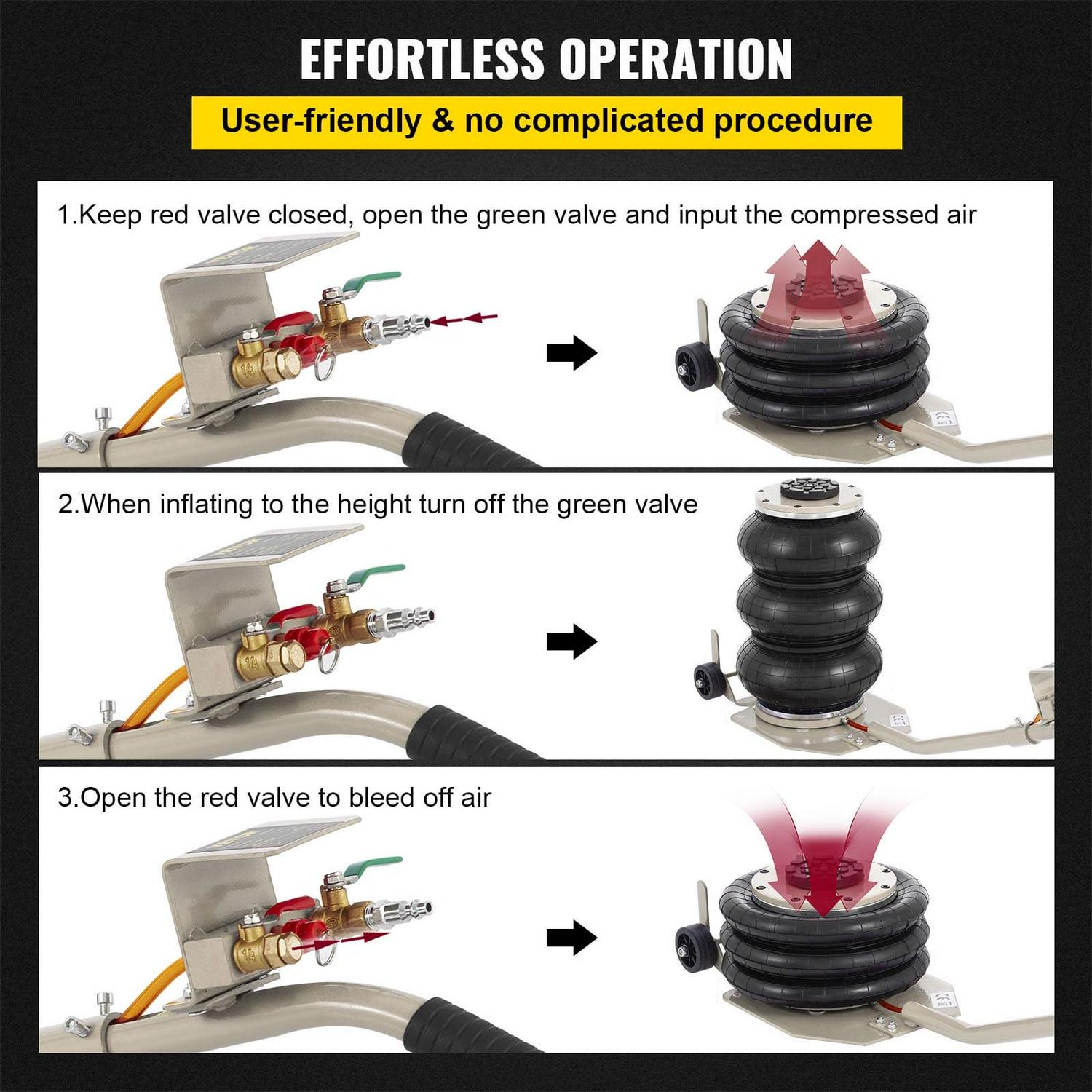 – Easy to Use: Powerful and very fast to use. The triple bag jack is the easiest and fastest way to make the car lifted. It inflates with compressed air.