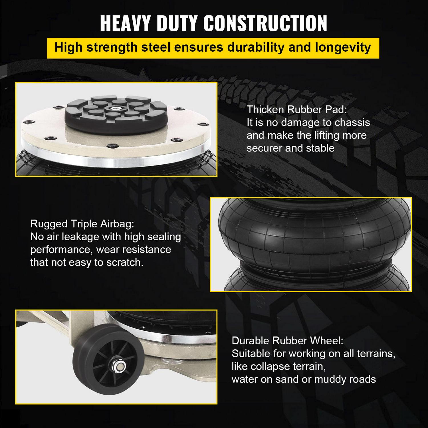 – Heavy Duty Construction: The pneumatic jack is made of high strength steel, the whole body is sturdy and durable. The larger stressed area fits in a soft and easy-collapsing place.