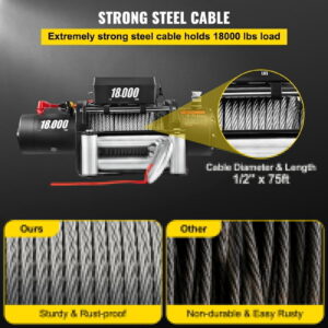 – High Tensile Steel Cable: Cable length: 75ft (22.8 m); cable diameter: 1/2″ (12.7 mm); The electric winch is equipped with the stronger steel cable rope. It allows you to quickly get rid of the predicament of cars getting stuck in the mud, broken down, and stranded on the beach.