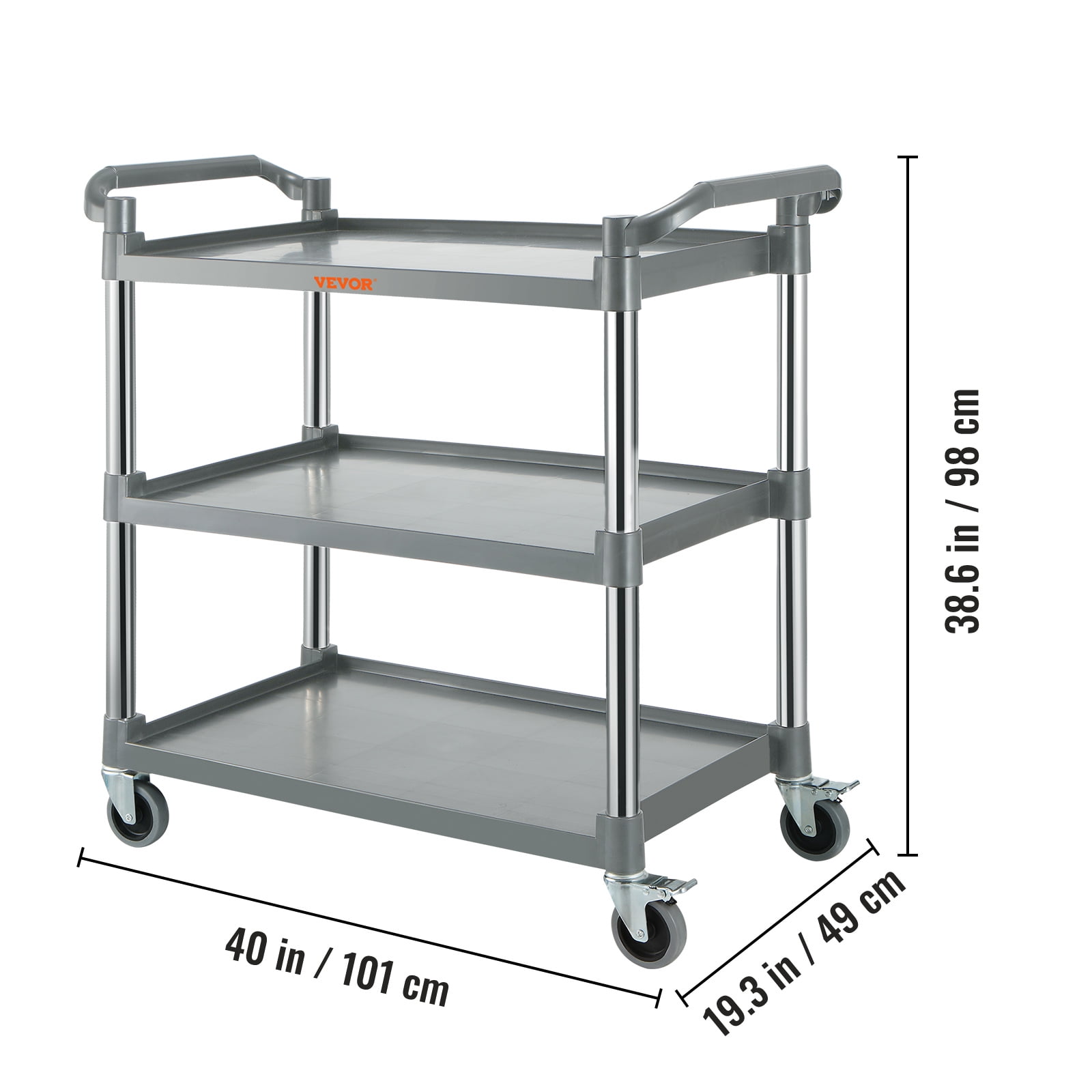 Brand Introduction VEVOR is a leading brand that specializes in equipment and tools. Along with thousands of motivated employees,VEVOR is dedicated to providing our customers with tough equipment & tools at incredibly low prices. Today, VEVOR has occupied markets of more than 200 countries with 10 million plus global members. Why Choose VEVOR? 1.Tough Quality Assurance 2.Incredibly Low Prices 3.Fast & Secure Delivery 4.30-Day Free Returns 5.24/7 Professional Customer Service Product Description Multifunctional Utility Service Cart 3-Tier Storage & 220 LBS Loading & 360° Rotating Wheel Quality Can’t be Beaten This rolling utility cart is made of durable injection-molded polypropylene and aluminum frame, it is easy to clean, will not dent, and is resistant to rust and stains. Comfortable handles on both ends for hanging accessories including trash and grocery bins (not included). Extensive Storage Capacity Our service cart with wheels has a spacious interior for holding your stuff, it features three layers and measures a wide opening of 40″ / 101 cm, and its depth reaches 19.3″ / 49 cm. perfect for storing your dishes, tools, books, greenery, toys, etc. 4 Flexible Wheels There are four rubber wheels to help with handling, all of which are gimbaled. Each wheel has a diameter of 4 inches, which allows the cart to run smoothly on a variety of surfaces, such as tile, asphalt, carpet, concrete, etc. Large Bearing Capacity Structural foam is more durable than other materials, providing a load rating of 88 pounds per layer and a total combined load of 220 pounds, allowing for good organization of your space. Easy to Install The complete set of accessories and a detailed insrtuction help you to install the 3 shelf service cart quickly. Note that when installing the wheels, please turn the plastic service cart upside down and use a rubber mallet to drive the wheels directly into the holes. Wide Applications This multifunctional utility cart with wheels is perfect for use in restaurant, library, store aisle, garage, classroom or office space. Specifications Color: Grey Mateial: PP+Aluminum Number of Wheels: 4 Caster Type: Swivel Maximum Weight Capacity: 220 lbs / 100 kg Each Layer Load Capacity: 88 lbs / 40 kg Item Weight: 22.3 lbs / 10.1 kg Product Dimensions: 40 x 19.3 x 38.6 in / 101 x 49 x 98 cm Package Content 1 x Utility Service Cart 1 x Set of Accessories 1 x Insutruction Manual