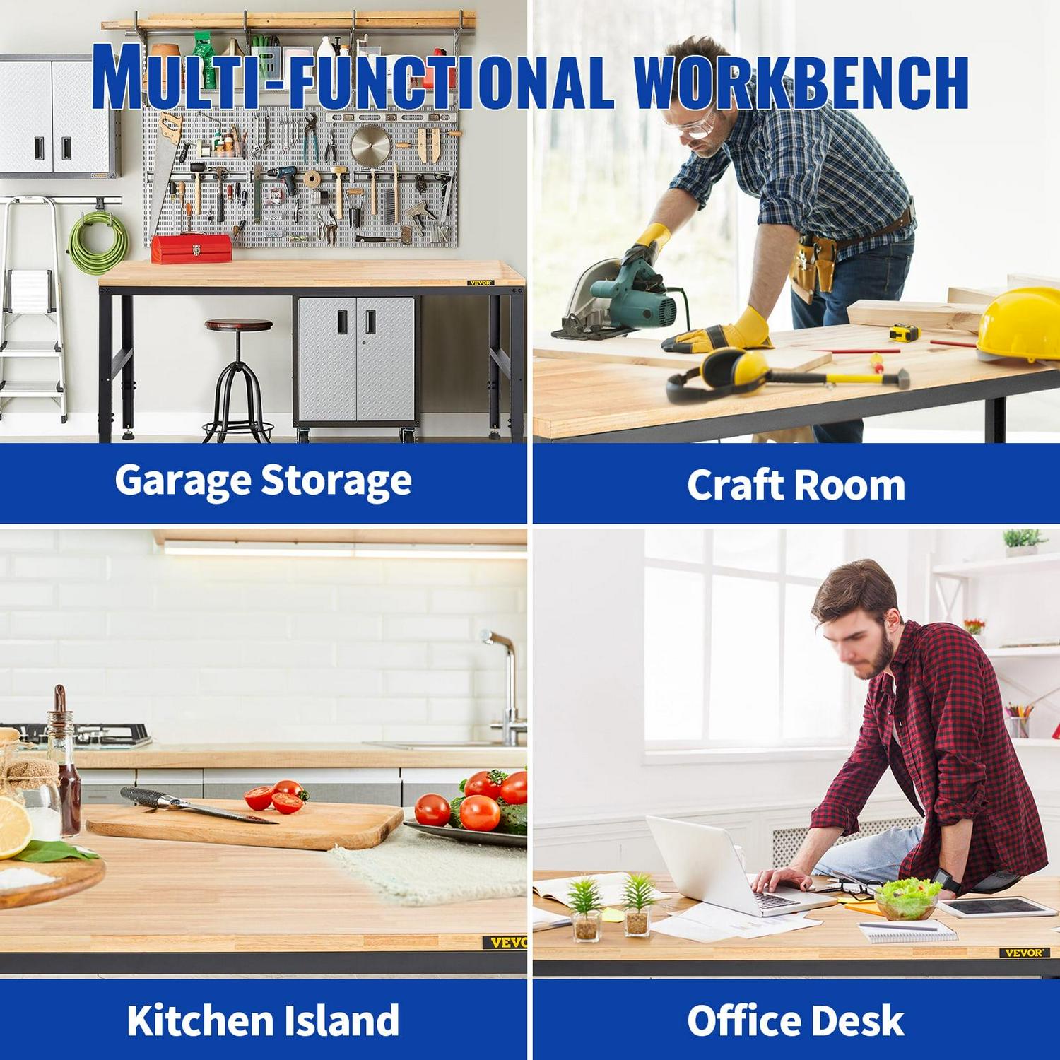 VEVOR Workbench Adjustable Height, 48 L X 20 W X 38.1 H Garage Table w/ 28.3 – 38.1 Heights and 2000 lbs Load Capacity, with Power Outlets and Hardwood Top and Metal Frame and Foot Pads, for Office Home