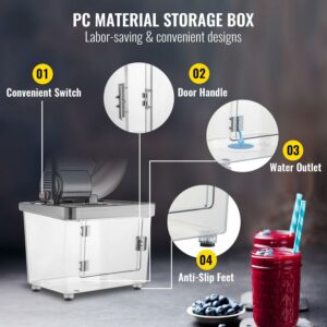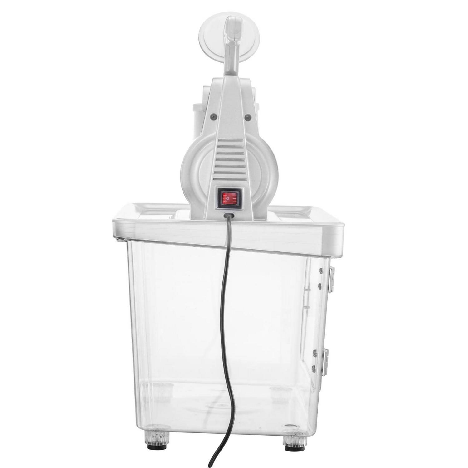 – Integrated PC Storage Box: An extra-large PC storage box is integrated into our electric shaved ice machine, adopting the technique of one-piece injection moulding. It measures 18.5″ (47 cm) long, 14.2″ (36 cm) wide, 14.2″ (36 cm) deep, and 0.2″ (4 mm) thick, which is capable of holding around 9 Gal (34 L) of shaved snow ice. The thick case wall can keep the crushed ice inside frozen for longer, and the snow-ice won’t splash everywhere for secure operation concerns.