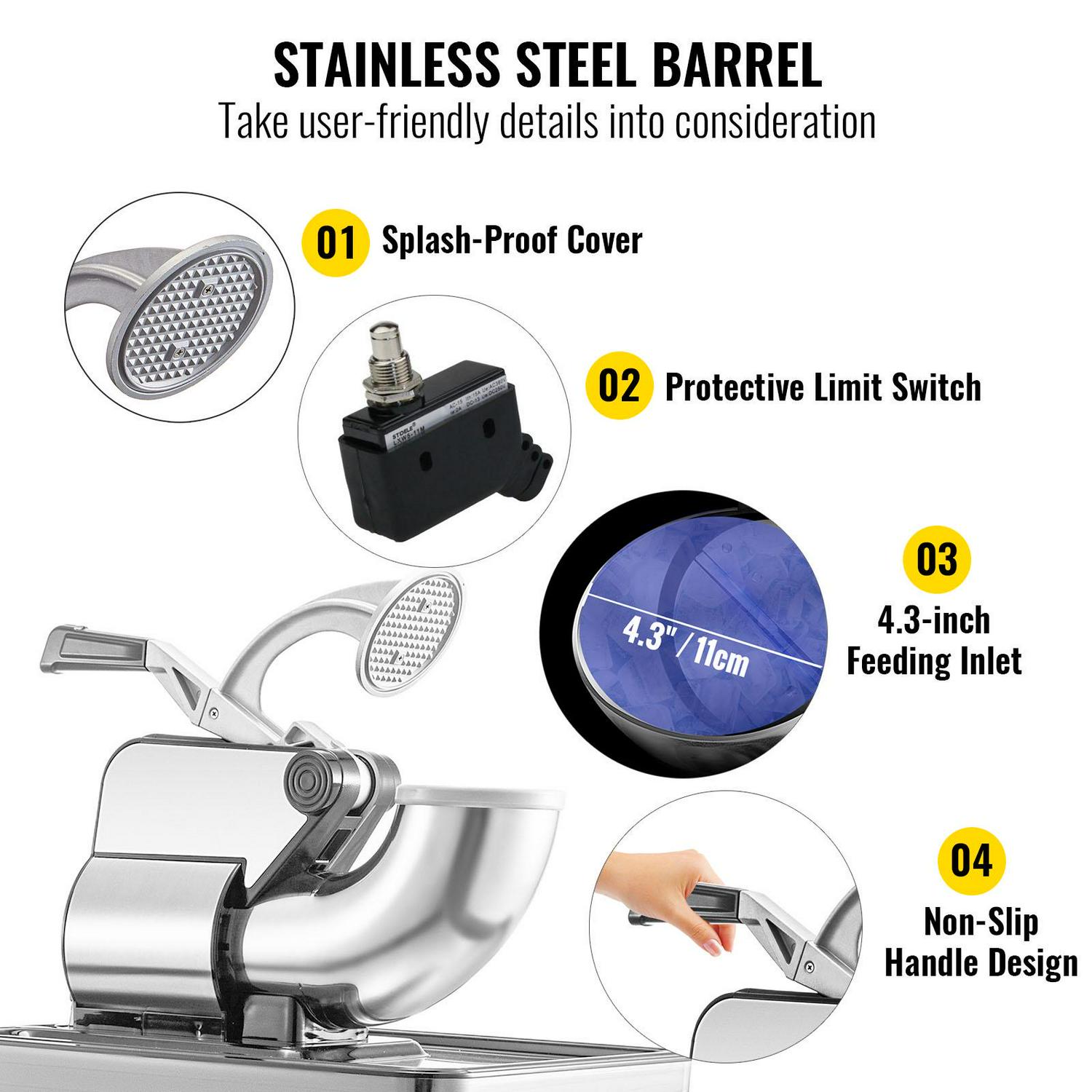 – Details for Comfortable Use: Thoughtful designs for improving your user experience are also combined on our snow cone maker. The non-slip handle is ergonomically designed for labor-saving operation. With the water outlet below, you can discharge the melted ice timely. The rubber feet at the bottom can stabilize the machine. The limit switch serves to enhance security. And waterproof on/off control minimizes the restriction on operating when your hands are wet.