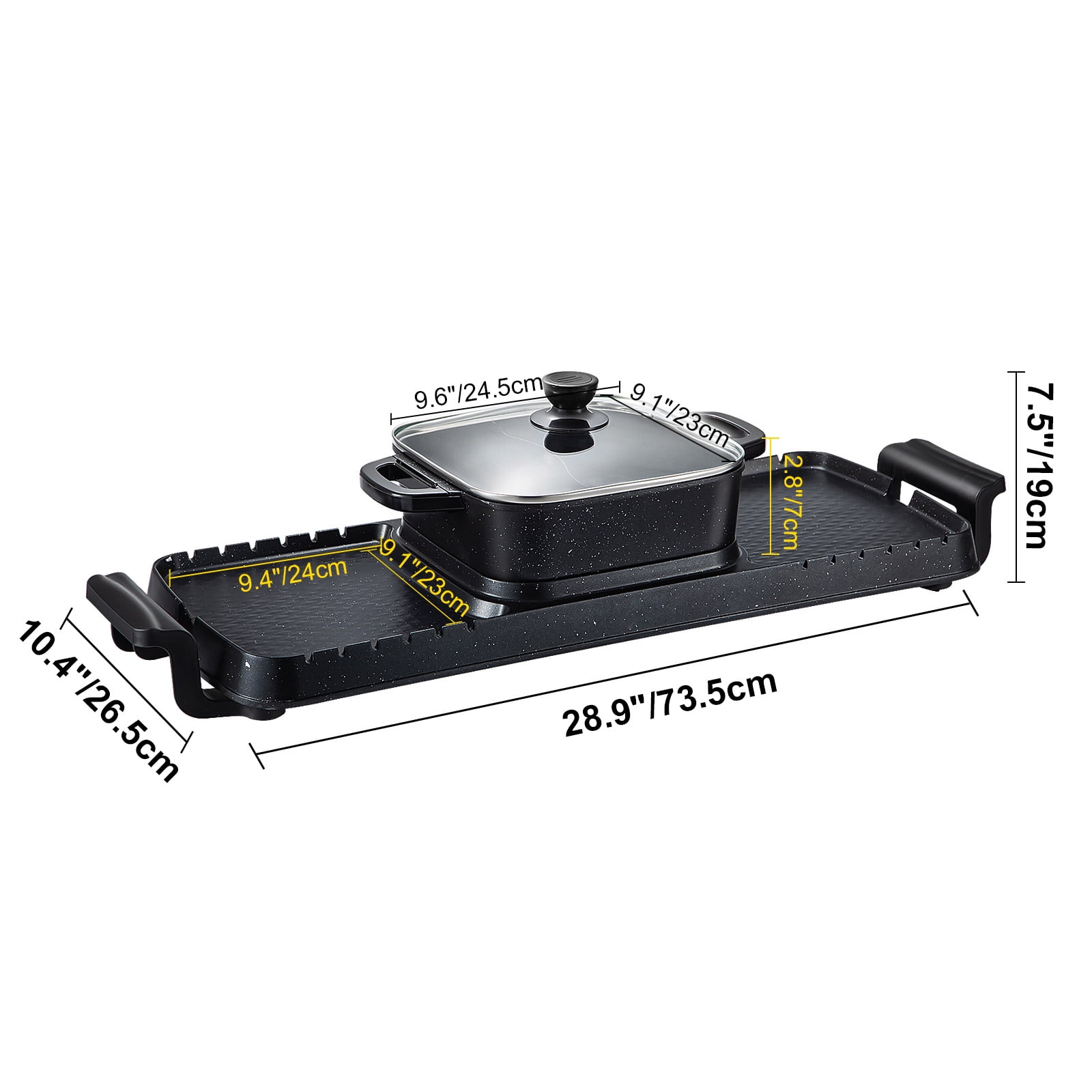 【2 in 1 Hot Pot Grill】: Our black electric hot pot grill combines a hot pot and 2 grill areas for multipurpose use, allowing you to enjoy hot pot and barbecue simultaneously. The 2.5Qt / 2.8L capacity hot pot contains a divider for carrying 2 tastes of food, while the grill plates adopt the groove design for skewers. Dual-purpose offers double fun. 【Separate Dual Thermostat】: Our hotpot and grill are equipped with 2 independent temp control knobs. You can precisely adjust the heating temperature from 356℉ to 464℉ with 5 speeds. With an 800W heating tube for the hot pot and 2 tubes with 1600W total power for the barbecue grill, our machine offers you a high-efficient and stable heating experience. In addition, it also has overheat protection, which will auto shut off when the temperature is up to 464℉. 【Excellent Cooking Material】: Made of cast aluminum with nonstick coating, the body of our hotpot grill combo is heatproof, easy to clean, and sturdy to use. The tempered glass lid is well-designed to block the steam inside and avoid accidents. Besides, the bakelite handles keep your hands from scalding during operation. 【Innovative Design】: The oil leakage outlets on the grill plate can effectively discharge excess oil and reduce the amount of smoke produced. The detachable design is convenient for you to clean the hot pot. The base plate has excellent heat insulation, ensuring that the heat remains in the cooking areas. 【Versatile Use】: This BBQ grill hot pot is perfect for 1-8 people in family gatherings, friend parties, and dinners. It is widely applied in heating and grilling meats, steaks, vegetables, shellfish, etc.