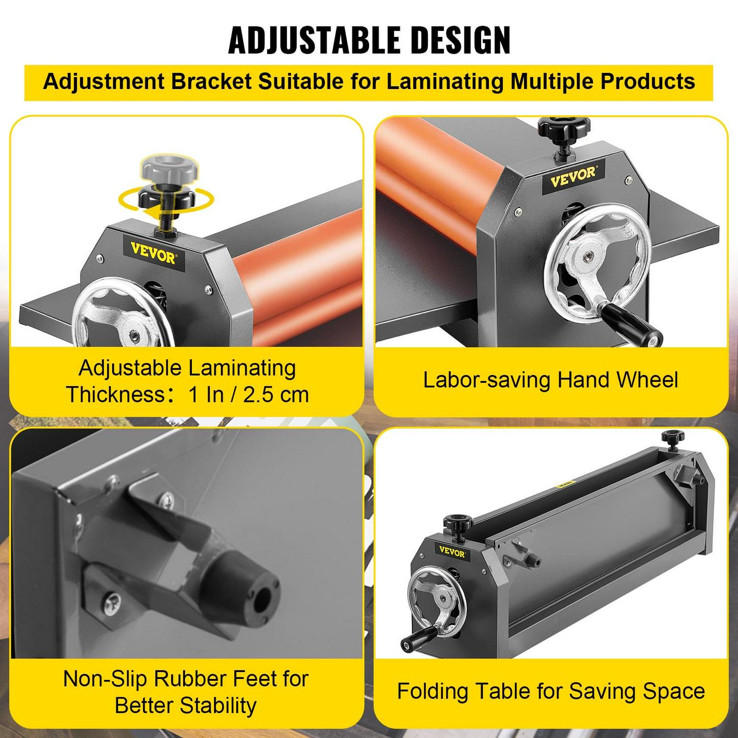 – Adjustable & Folding: Hand crank laminating machine adapts the adjustable roller position, suitable for various material thicknesses; the folding table is convenient for storage and easy to use.