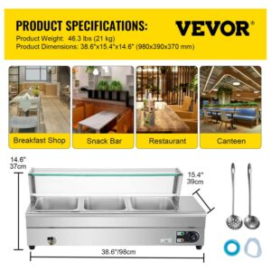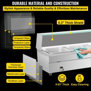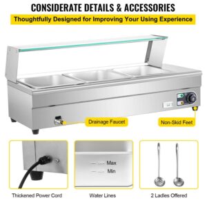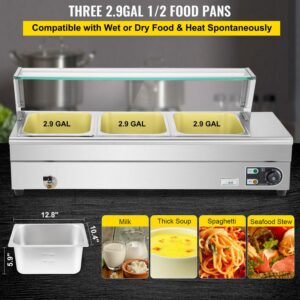 VEVORbrand 3-Pan Bain Marie Food Warmer 6-inch Deep, 1500W Electric Countertop Food Warmer 33 Quart with Tempered Glass Shield, 110V Food Grade Stainelss Steel Commercial Table with 3 Lids and 2 Ladles