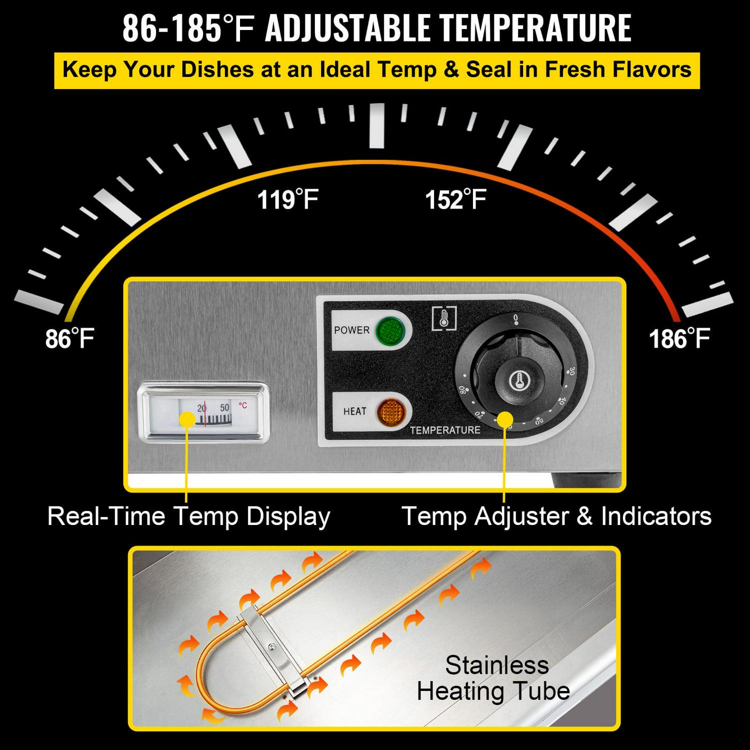 – FAST HEATING – With a rotary button for precise control of temperature, 86-185 (30-85 ) adjustable, our Bain Marie food warmer features a thermometer for direct observation of the real-time temperature, and two indicators to show working status. It adopts a 304 stainless steel U-shaped heating tube, with three-dimensional heating, for efficient heat transfer. (NOTE: Do not dry burn the heating tube. The heating tube should be submerged in water.)