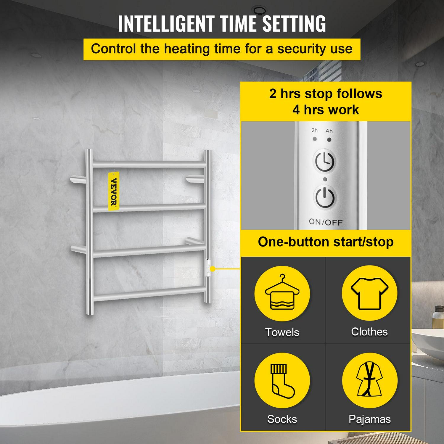 The electric towel drying rack is equipped with a digital timer that controls an automatic start/stop function if you do not stay in your room.